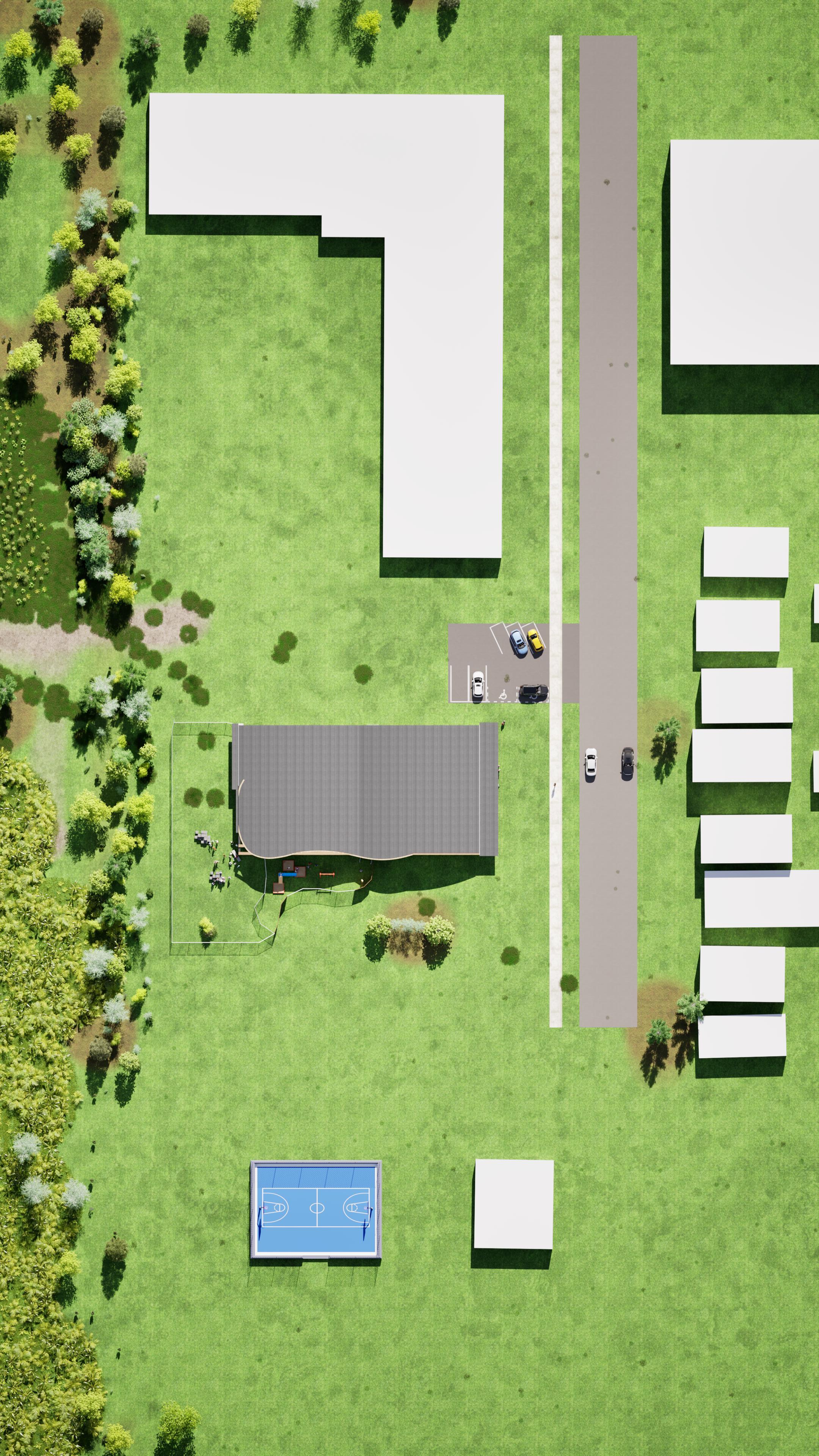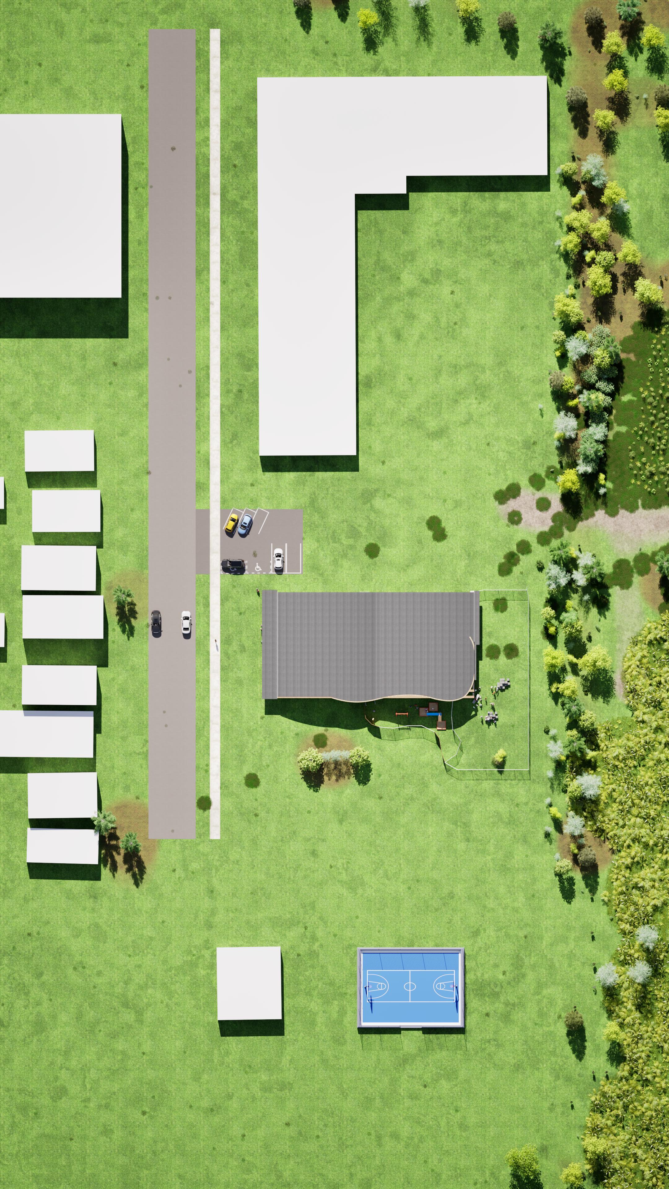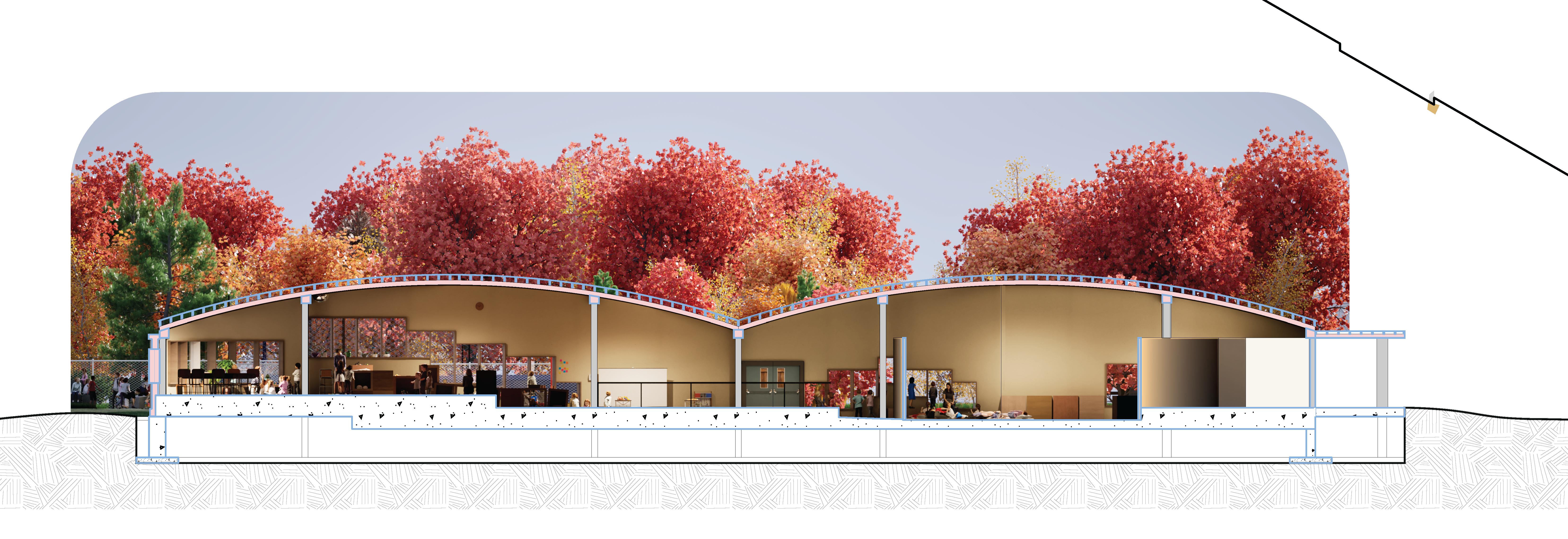 This play and education centre was developed as part of a studio project for a daycare/school, requiring a full architectural proposal from concept and site planning to classroom design, sections, perspectives, and introduction to Ontario building code integration. The brief placed particular emphasis on habitation, outdoor play, safety, indoor-outdoor relationships, and the design of spaces that support childhood development through both everyday use and imaginative exploration.