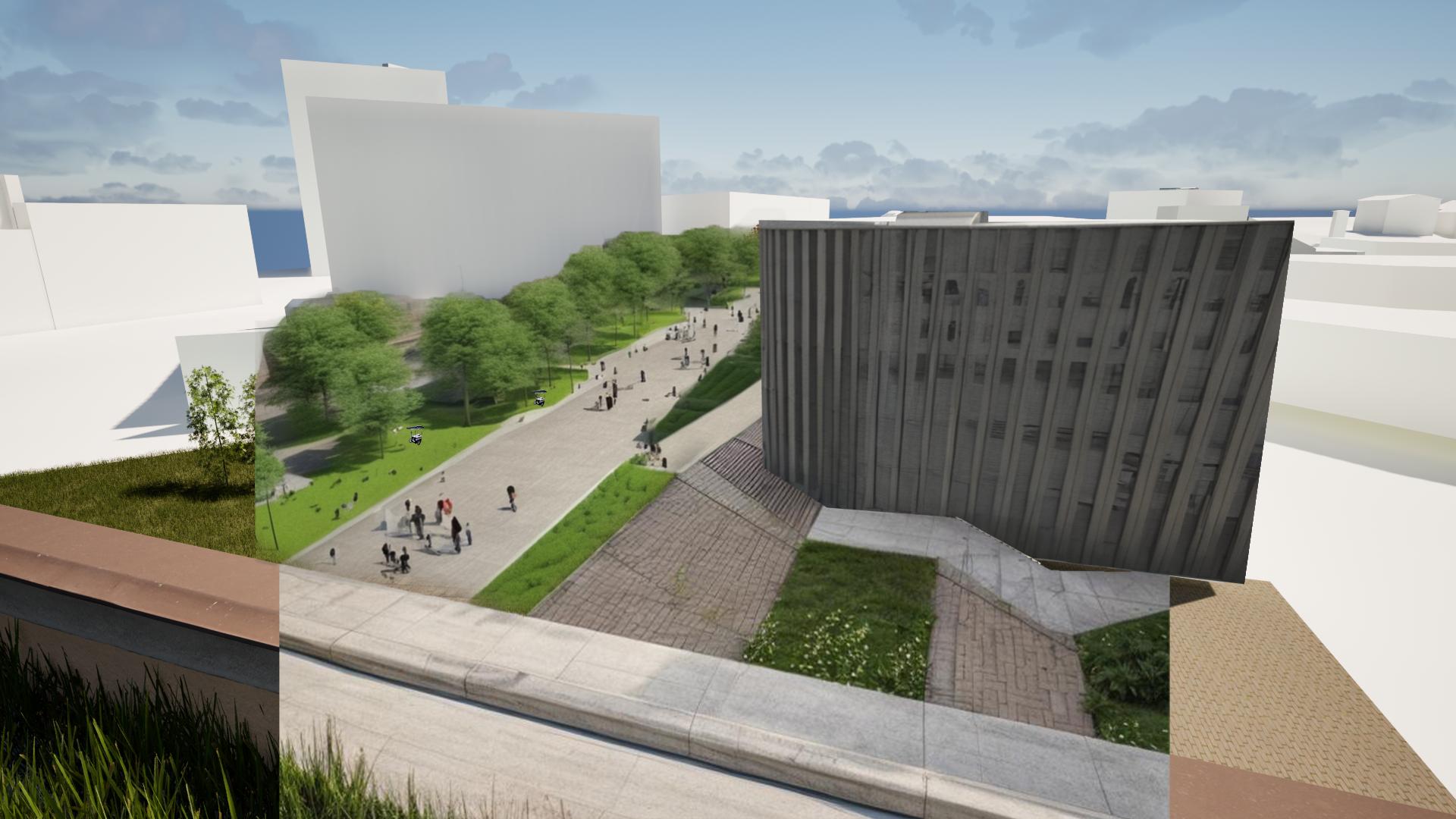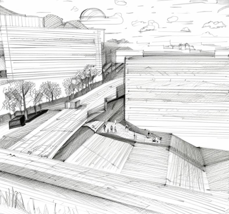 Our goal for this project is to create a space that animates downtown Sudbury, by creating walking and cycling paths that connect the center; while vehicle traffic is separate and designated, encouraging pedestrians to walk and experience the site. The main concept revolves around integrating green space with an appreciation for the lakes in Sudbury. An analysis of six nodes of the dowtown, gives an understanding of the current experience of certain moments, and how they influence the overall feel of city life; a on-the-ground perspective of the existing spaces and uses. From this, we went in-depth on the characteristics of the site and Sudbury's surroundings. The zoning analysis was carried out to get a better understanding of the existing community, and how to optimize the site to add to and improve on the lacking aspects. Given this, housing is implemented on the site, incorporating the concept of mixed-use spaces. Although the site appears to be flat, the analysis revealed that it has a relevant slope towards the north. In combination with the height of Tom Davis Square, a raised pedestrian walkway can be implemented above Brady Street. It will create an unobstructed path of travel between park spaces and the site. This will also further separate cars from our site separating the modes of transportation optimizing each for it’s self, as well as encouraging walking throughout. With this urban renewal, Sudbury will be recognized as the City of Lakes, this is done by emphasizing the concept by representing it in the layout, materiality, and experience.