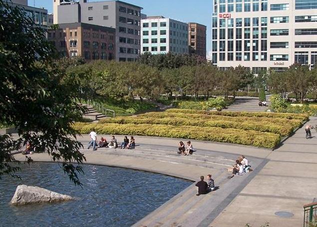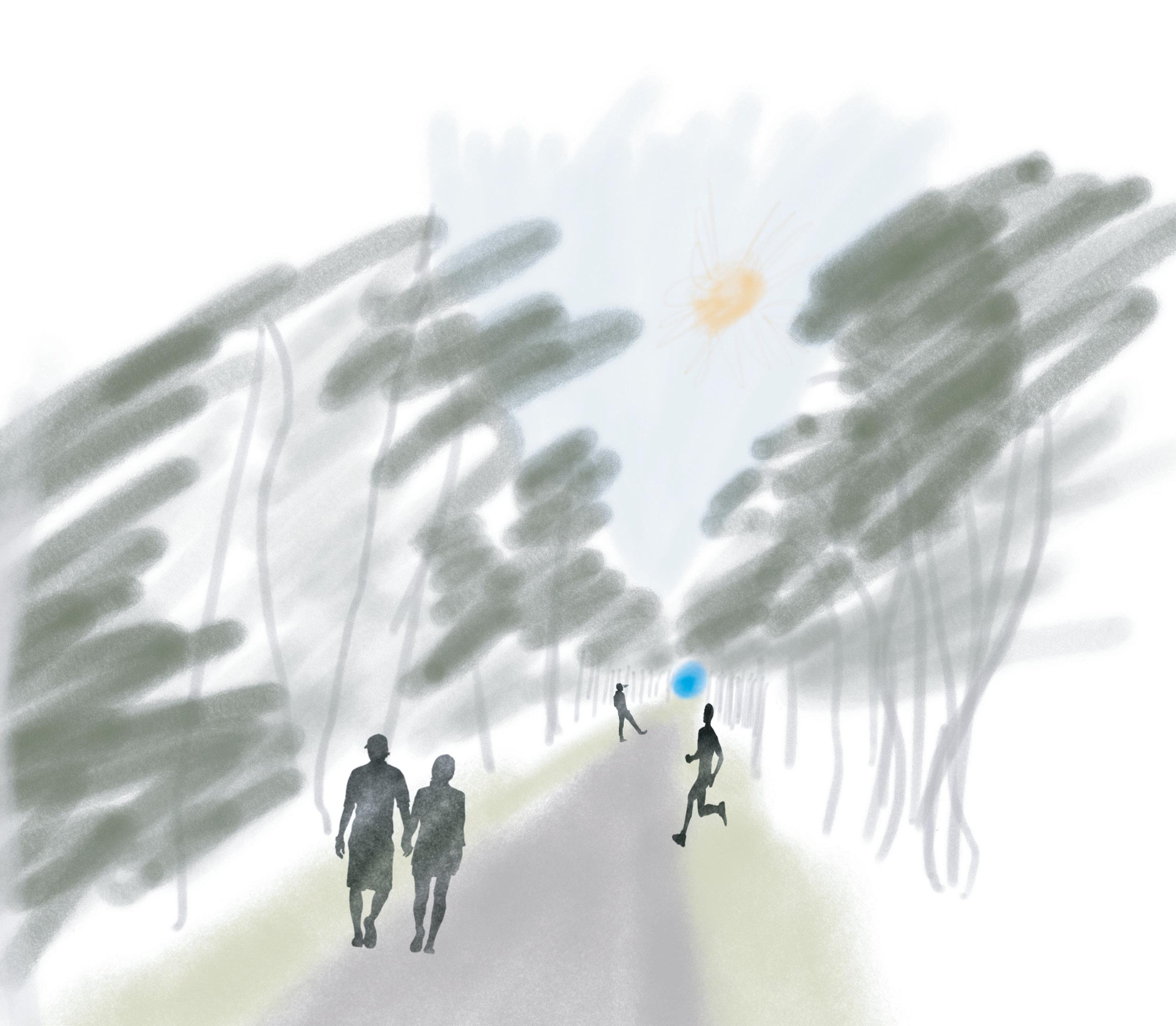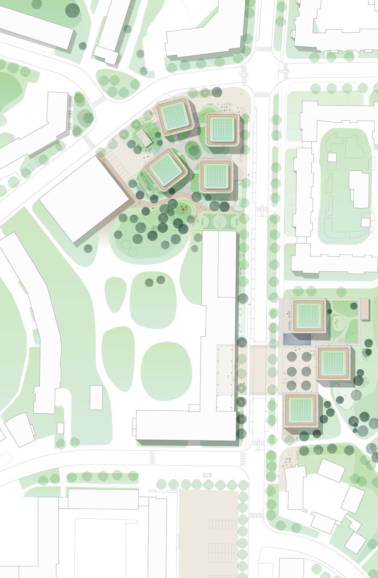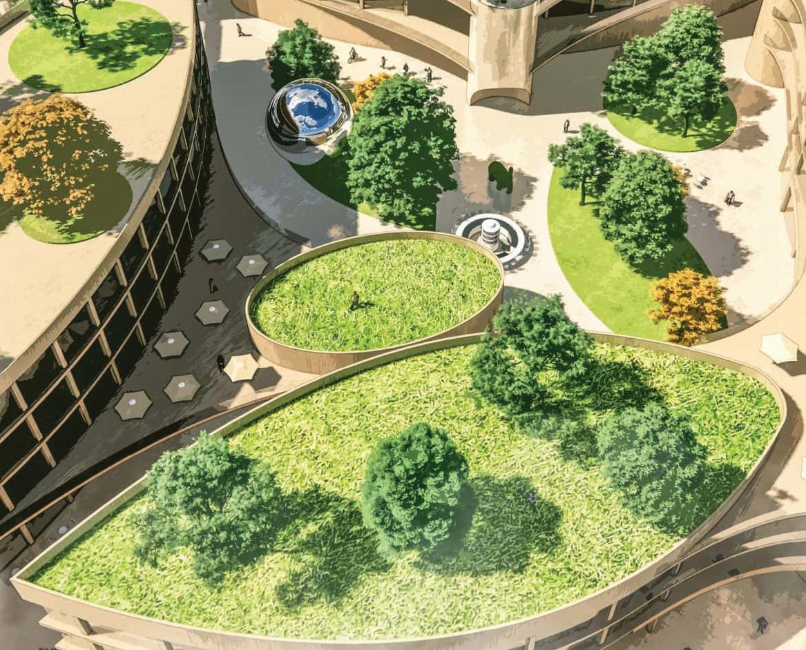 northward slope and the height of Tom Davies Square to introduce an elevated pedestrian connection above Brady Street, linking park spaces and reinforcing a more continuous public realm. Green space, seasonal flexibility, and lake-oriented identity shape the broader strategy, with wide paths and alleys designed to support everyday movement, winter maintenance, temporary summer terrasses, and cold-season activities such as skating. Rather than treating the downtown as a series of isolated parcels, the plan uses landscape, circulation, and phased intervention to stitch together a more cohesive and animated urban environment, proposing a future in which nature, density, and public life are more fully integrated.