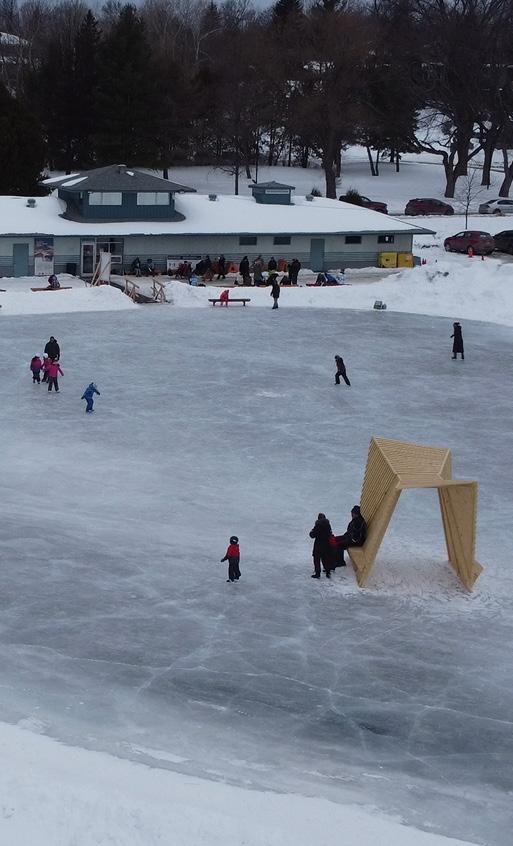 This project emerged from a design-build studio framework centered on Design for Place, asking students to respond directly to the environmental, and icy conditions of Ramsey Lake in winter. Developed collaboratively as one of a series of ice station teams, The Passage approached design as a site-specific and informed process (incorporating Jan Gehl’s principles), using observation, analysis, and hands on making. The brief emphasized responsiveness to climate, material restraint, and the creation of meaningful public space within an extreme seasonal setting. The Passage organizes movement as an experiential journey through the frozen site, visitors are guided through the structure, experiencing shifts in light and shadow, compression, and offered different views.