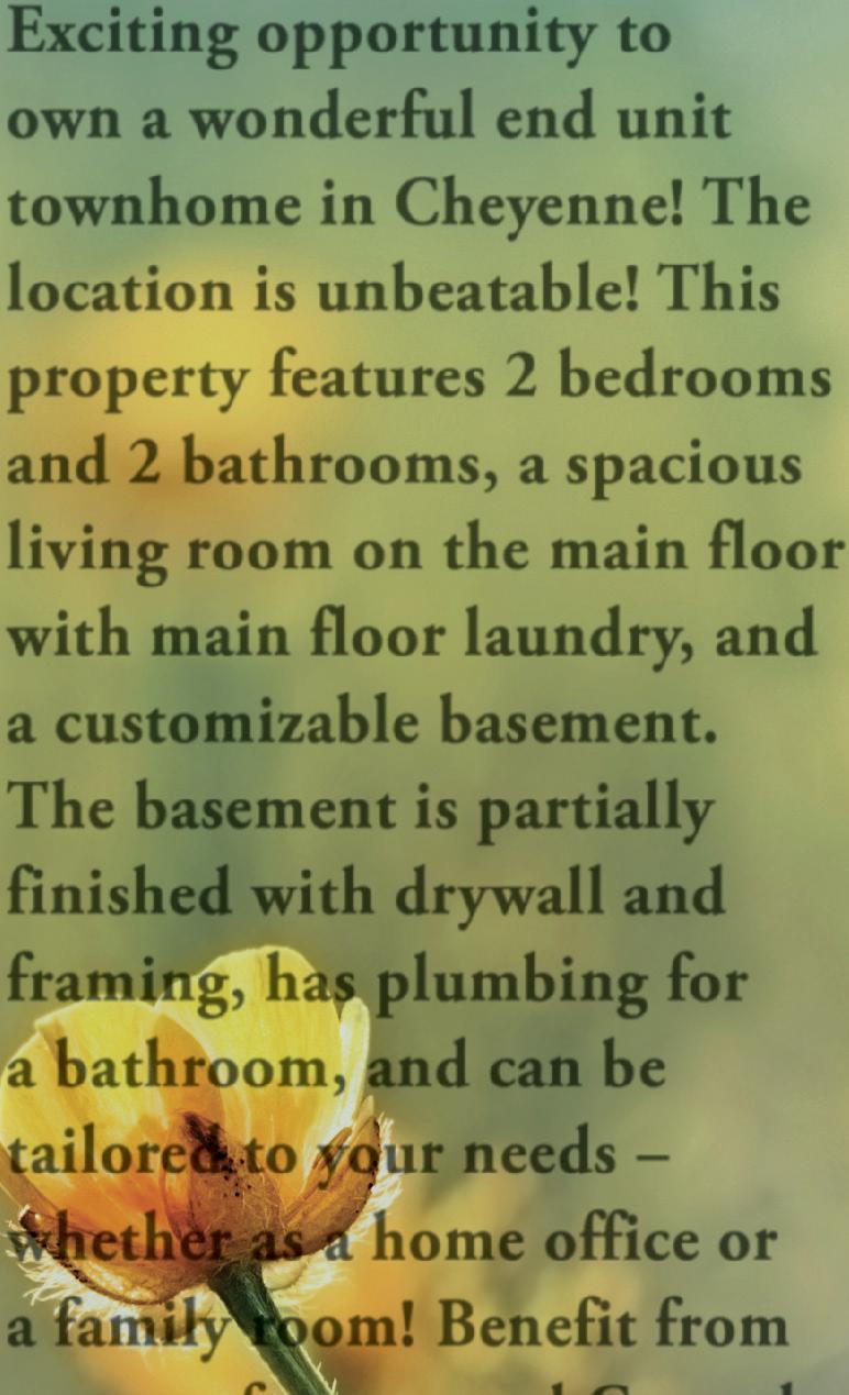 Exciting opportunity to own a wonderful end unit townhome in Cheyenne! The location is unbeatable! This property features 2 bedrooms and 2 bathrooms, a spacious living room on the main floor with main floor laundry, and a customizable basement. The basement is partially finished with drywall and framing, has plumbing for a bathroom, and can be tailored to your needs –whether as a home office or a family room! Benefit from a newer furnace and Central AC. Enjoy the large fenced backyard. This home is movein ready! Plus, no HOA fees! Not only ideal as a primary residence but also a fantastic rental opportunity! Check out the virtual tour link to view a 3D tour and dollhouse model of this great home!
