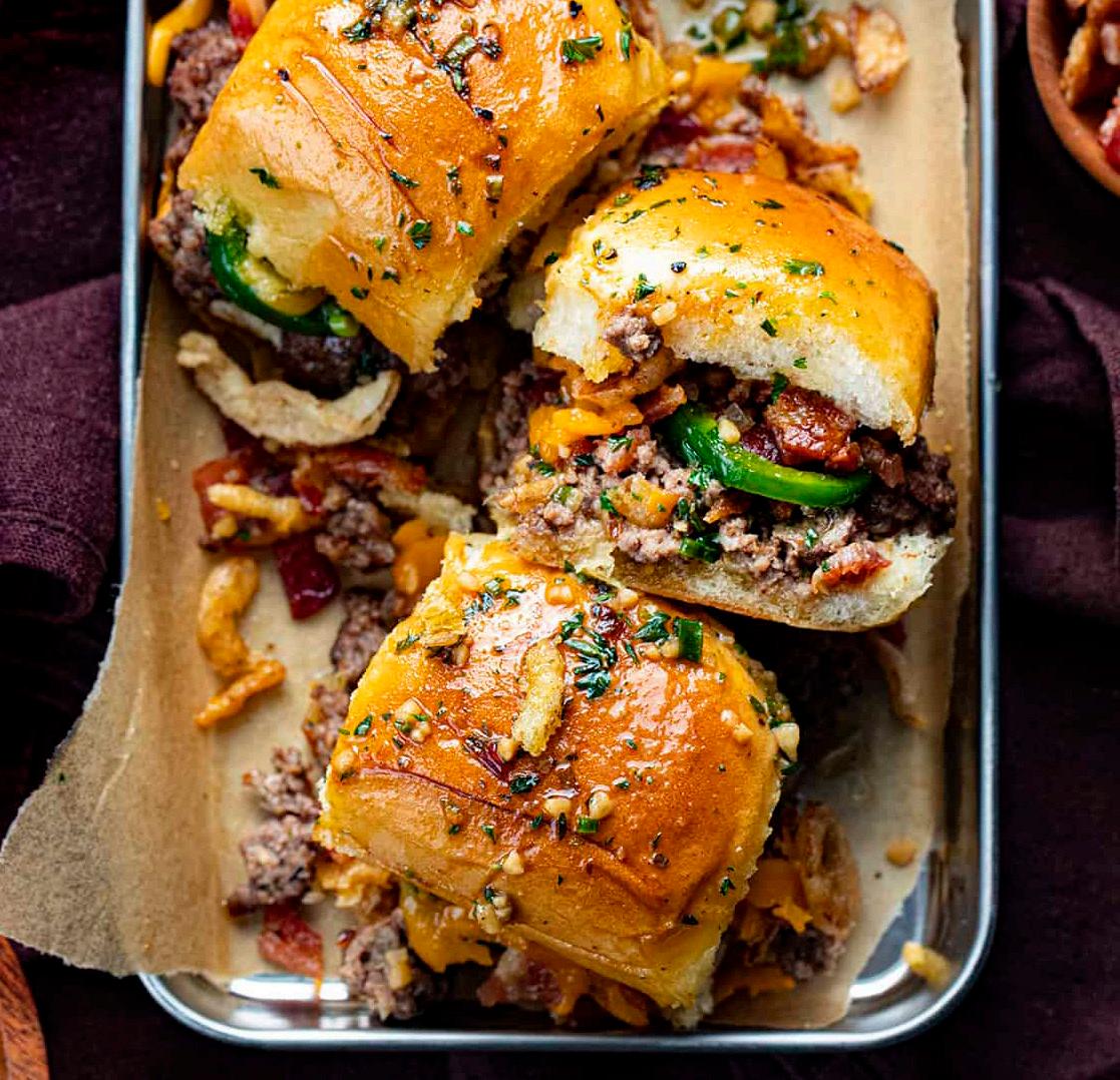 Layer cheese slices over the rolls in the pan, top with hamburger mixture. Evenly distribute jalapeños, shredded cheese, bacon, and fried onions over the mixture. Cover with the top half of the rolls.