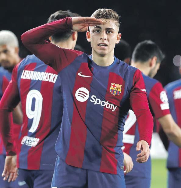 Yamal, Fermín y Cancelo celebran uno de los goles ante el Nápoles. ALBERTO ESTEVEZ /