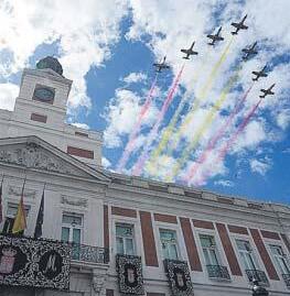 O6 Bandera de España en el cielo. Varios aviones sobrevuelan el cielo a su paso por la sede de la Presidencia de la Comunidad de Madrid en la Puerta del Sol. ●