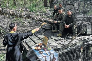Un sacerdote celebra, ayer, la misa de Pascua para soldados del Ejército ucraniano en el frente. EFE