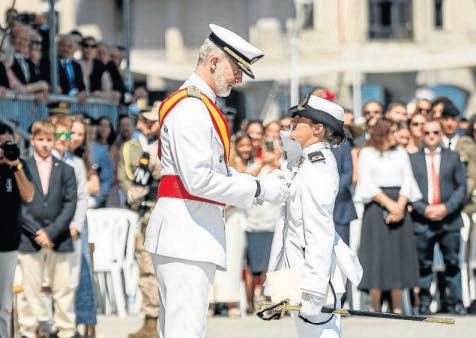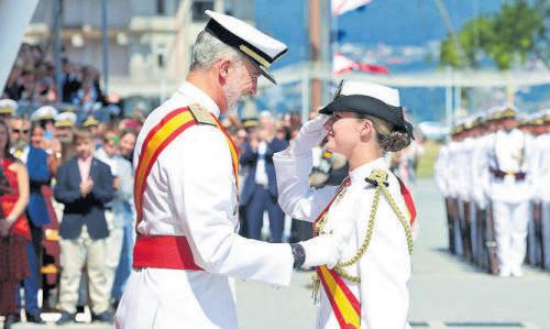 Además de asistir al acto de graduación, el rey fue testigo de cómo otros 86 aspirantes de primer curso de la escala de oficiales, siete de ellos mujeres, juraron bandera. Compañerismo y austeridad Tras del desfile de los nuevos oficiales, el comandante director del centro, el capitán de navío Pedro Cardona, se dirigió a estos y señaló que confía en que este año que han pasado en la Armada les valga «para toda la vida». Además, destacó que la princesa ha conocido que el mar «es un aprendizaje y un desafío permanente ante el que no caben excusas dada su intransigencia», lo que les obliga a actuar siempre «con lealtad, disciplina, valor, compañerismo, responsabilidad, ejemplaridad y austeridad», valores que, según Pedro Cardona, el rey les pidió «fomentar expresamente» en la princesa de Asturias l