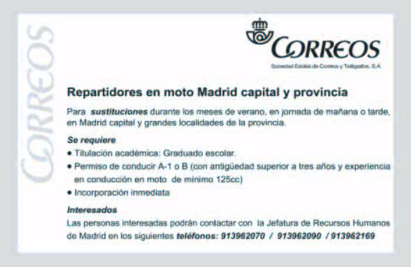 DIRECTOR: ArsenioEscolar. Directoradjunto: JoanF.Domene. Subdirectores: CharoRuedayKikeCalvo. Producción: FranciscoF.Perea. PUBLICIDAD: LuisAlbertoRivero(director),M.ªJesúsRodríguez(dtora.adjunta),MiguelÁ.GonzálezNovoayElenaHerráiz(jefesdepublicidad). Marketing: RafaelMartín. Distribución: JuanR.Marín. Administración: LuisOñate. Sistemas: JuanA.Balcázar. GerenciaWeb: JuanjoAmorín. MADRID PlazadelCallao,4.28013Madrid.Tel.917015600.Fax:917015660.zona20@20minutos.es Barcelona: 934706 250. Sevilla: 954500710. Zaragoza: 976468690. Valencia: 963509338. Alicante: 965142555. Málaga: 952364730. Granada: 958216250. Murcia: 968205270. Córdoba: 957498808. Bilbao: 946613453. Valladolid: 983362225. Vigo: 986443536. ACoruña: 981218741. Imprimen,ImcodávilayBermont.D.Legal:TO-406-00. LUNES16DEJULIODE2007 ● www.20minutos.es PrimerdiarioconlicenciaCreativeCommons.Queremosquetesientaslibredecopiar,distribuiryusarnuestrotrabajo.Leenuestrascondicionesde copiaenwww.20minutos.es cc Edita: MULTIPRENSAYMASS.L. DirectorGeneral: JoséAntonioMartínezSoler. 20MINUTOSESPAÑA Presidente: SverreMunck. Vicepresidente: AntonioAsensio.