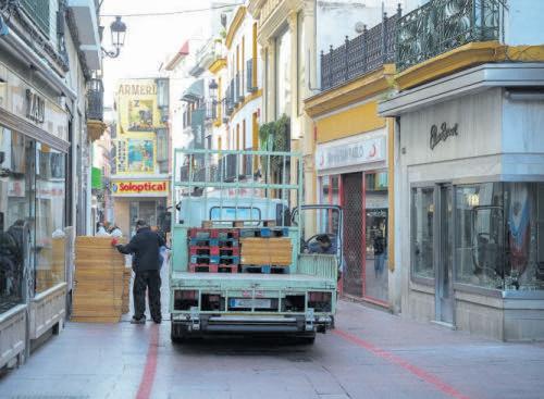 Operarios empiezan a colocar las sillas de la carrera oficial en la calle Sierpes, ayer. JOAQUÍN CORCHERO/EP