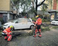 O 2 Daños materiales. Aunque afortunadamente no hubo que lamentar heridos graves, la borrasca sí provocó ayer numerosos daños materiales. Tanto que algún municipio valora pedir la declaración de zona catastrófica, como Lebrija. En la imagen, los Bomberos trabajan para retirar un árbol caído sobre un coche en Sevilla.