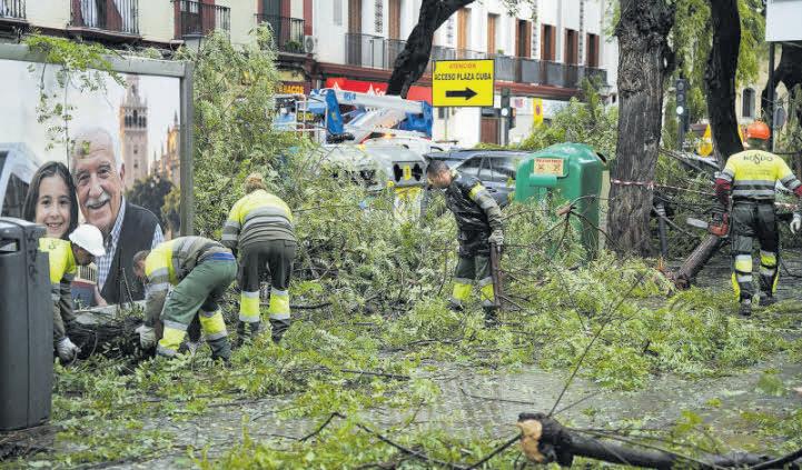 contabilizó otro herido más en Cádiz a causa de la caída de la rama de un árbol. Mejoría para hoy Precisamente los árboles fueron el principal problema en Sevilla capital. Cientos de ellos cayeron al suelo, algunos de gran porte, dejando una herida leve en el recinto del hospital Virgen del Rocío. En la ciudad, que registró 200 incidencias, murió un trabajador en el nuevo barrio de Palmas Altas durante la construcción de una promoción de viviendas al caerle encima una placa y quedar atrapado. Supone el primer accidente laboral mortal de este año y, aunque no está directamente vinculado con la borrasca, desde CCOO recordaron la «obligación de las empresas a adaptar la actividad a la meteorología». La lluvia y el viento parece que darán hoy tregua, sobre todo en Andalucía occidental, donde se han reducido los avisos de la Aemet, sin que en Sevilla haya ninguno previsto. Para finales de semana se espera la llegada de «otra borrasca intensa». l