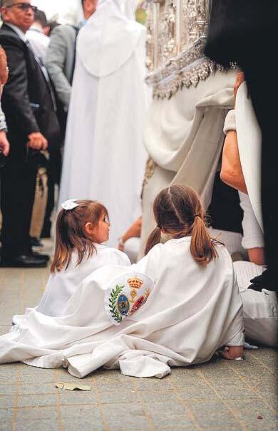 El futuro de las cofradías Dos pequeñas nazarenas de La Paz descansan un rato en el suelo mientras observan a los costaleros debajo del paso de palio, tras su salida de la iglesia de San Sebastián.