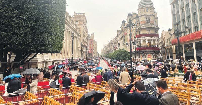 una cofradía en la calle, la única que ayer completó su estación de penitencia, La Borriquita, uno de los cortejos más populares de la ciudad gracias, en parte, a sus niños nazarenos. La Sagrada Entrada en Jerusalén salió de la iglesia del Salvador un poco antes de lo previsto y transitó más rápido de lo habitual para volver a su templo sin mojarse en apenas tres horas. Y dejó una de las estampas más típicas del Domingo de Ramos en Sevilla, el primer nazareno de la Semana Santa pidiendo la venia en la Campana. Una jornada, en definitiva, deslucida por una lluvia que arreció aún más a última hora del día. Los sevillanos, y los muchos turistas que estos días se encuentran en la ciudad, salieron a la calle con sus mejores galas, como manda la tradición de este día, pero el ambiente de ayer distó mucho del de otros domingos de palmas, con numerosas sillas y palcos vacíos en la Carrera Oficial y muchos paraguas abiertos. Y, aunque esto no ha hecho más que empezar, parece que la tónica en la capital hispalense –y gran parte de Andalucía–va a ser similar hasta el mismo Domingo de Resurrección. Asistencia sanitaria Además de los estrenos de algunas hermandades, también ayer se estrenó José Luis Sanz como alcalde en esta fiesta mayor de la ciudad. El equipo de Gobierno que dirige ha decidido mantener la mayor parte de las medidas de seguridad establecidas en años anteriores, aunque con algunas novedades. Entre ellas, una cierta flexibilización en la Madrugada con la hostelería y la sustitución en algunas calles de las vallas para aforar el espacio por líneas rojas pintadas en el suelo. Medida esta última que podrá ser revocada por la Policía si esta considera necesario volver a vallar por razones de seguridad. No obstante, y si se cumplen los peores pronósticos meteorológi-