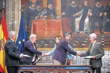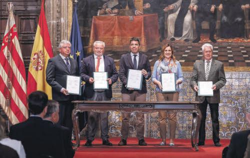 Mazón y Catalá, junto a los regantes, en el acto celebrado ayer en el Palau de la Generalitat. ROBER SOLSONA / EP