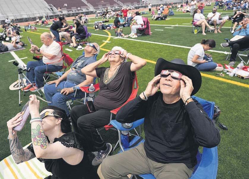 Vecinos de Eagle Pass, en Texas, se reunieron ayer en un estadio deportivo para poder ver el eclipse total de Sol. ERIC GAY / LAPRESSE