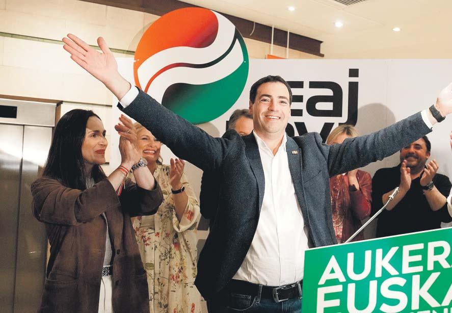 Tras agradecer «vivamente» la confianza depositada en su partido por la sociedad vasca y el apoyo popular que ha recibido, Ortuzar reconoció que estos resultados tienen «un claro mensaje de avanzar y de mejorar». Por ello, aseveró que su formación trabajará por el «bienestar de vascos y vascas», garantizando «unos servicios públicos de calidad y un autogobierno fuerte». «No vamos a defraudar esa confianza y nos vamos a dejar la piel en construir una convivencia sana y en gobernar para todas y para todos», remarcó el presidente del partido. Por su parte, el candidato a lehendakari, Imanol Pradales, agradeció todo el apoyo depositado en su partido. «Hoy se ha demostrado que nuestro pueblo es plural y esa realidad hay que respetarla y fomentarla», señaló el cabeza de lista del PNV. Además, Pradales afirmó que defenderá los intereses de toda la ciudadanía vasca y «con humildad y con trabajo» dará «todo por Euskadi todos y cada uno de los días». Asimismo, adelantó que conformará un Ejecutivo «formado por mujeres y hombres solventes». ● LÚA RODRÍGUEZ