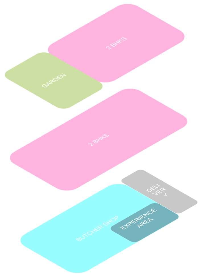 InThebuildingwillbalancethefoodrequirementsofthenearbyareabyprovidingabutcher shopwhichwillhelpnearbyfood-relatedbusinessesflourishandcreateharmoniousgrowth. Thebuilding’skeyfeatureswouldalsoincludeaveryprivacy-orientedintergenerational dwellingalongwithagreenspaceforrelaxation.