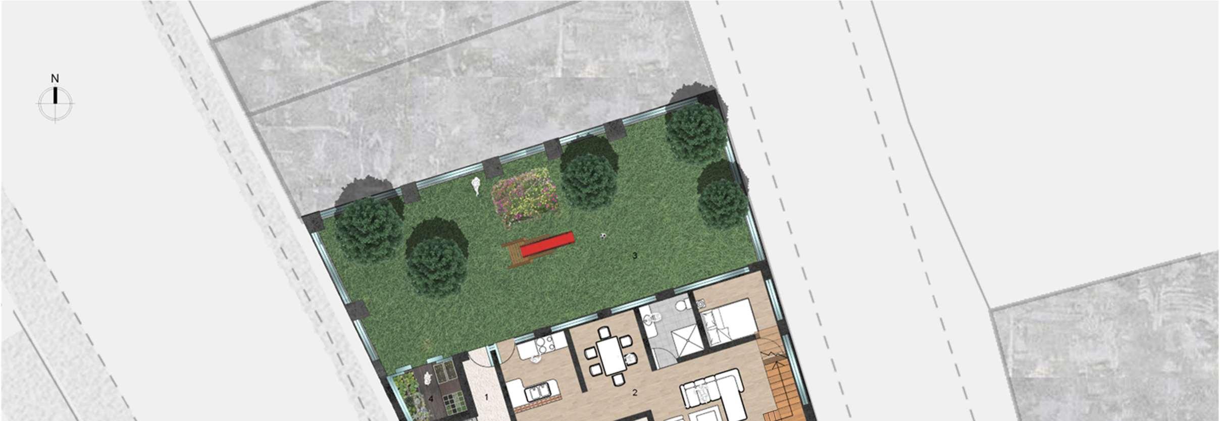 Thegreenspaceisdirectlyconnectedtothedwellingandiseasilyaccessible.Italso providesagreatviewfromthehallwayonthesecondstoreyandroomsonthefirst storey.Itincludesagreenhousetogrowplants,aslideforthekidstoplayandaflower bed.Itcanbeusedforavarietyofreasonsbutismainlyisaplacetorelaxandgetsome freshair.