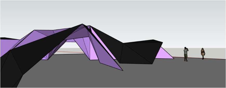 Architecturetomeisgivingmeaningtoexternal spaces.Thisbeginswithanidea,abasic sketch.Forme,thisbasicsketchisthestartand detailscanbeaddedtoiteasilyonmy computer.Thesoftwarestaystruetothecore butallowsforopeningsandredesigningofthe structure.SketchUpmadeitveryeasyformeto workwithcomplexorganicandnonorganic forms.Ithelpedmeunderstandthespatial aspects,andtheinclinationofthetriangular facetssothatwaterandsnowareabletoeasily fallofthestructure.Iwasalsoabletoworkon shadowsandlightwhichcreatestheentire atmosphereinsidethestructure.Itriedkeeping thespacesinsidefunctionalandkeeptheheight constantthroughout.Itriedtocreatean experiencefortheusersusingsinteresting geometricalgapsinthestructuretonaturallylet theminandlightandshadowstoguidethem.