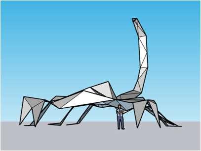 ScorpionCanopyThisismysecondSketchUpmodel.Itis inspiredbyascorpion.Thecanopyhasashinysilver exteriorandashinygoldinteriortoreflectasmuchlightas possible.Thelegsandclawsofthescorpionformstable supportforthewholecanopy.Itisopenonallsideswhich allowspeopletoenterfromeveryside.Thisalsoallows maximumlighttoenterandbrightenupthecanopy. Thetailofthescorpionarchesupwardsandformsan interestingarchitecturalelement.Theendingofthetailis shapedlikeanarrowpointingatthecanopyintheskywhich helpspeoplelocatethecanopy.Itcanbeplacedinapopular publicsquareandbecomeapopularattraction.Itisalmost likeasculpture.Theshinyoutersurfacewillalsoreflectthe skylineandenvironmentaroundthecanopy.