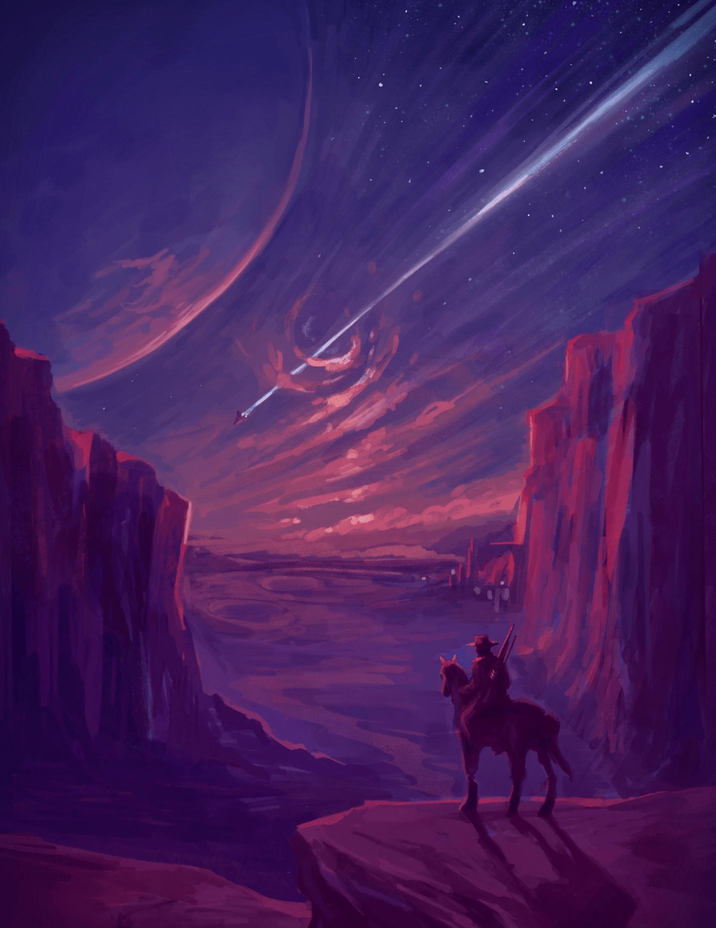 CB: When I first got this prompt, I thought this west theme needed a little bit more of the weird, so I decided that “space western” could be the twist. A lot of this month’s articles were about loneliness and existentialism which happened to fit the space stuff really well, I think. Ultimately though, what was prob ably most influential was that I am a sucker for sci-fi and space themes, so sue me.
