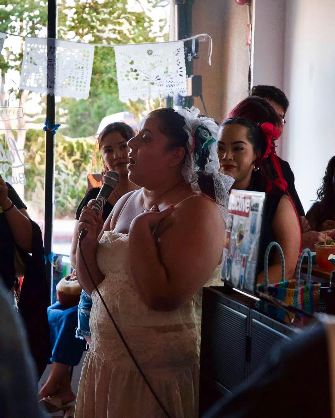 ▲ STEPHANIE LEZAMA, FOUNDER OF CHICAS Y CAFECITO, GIVING A SPEECH AT THE EVENT, SAZÓN Y SOL, TO HER FELLOW CHICAS.