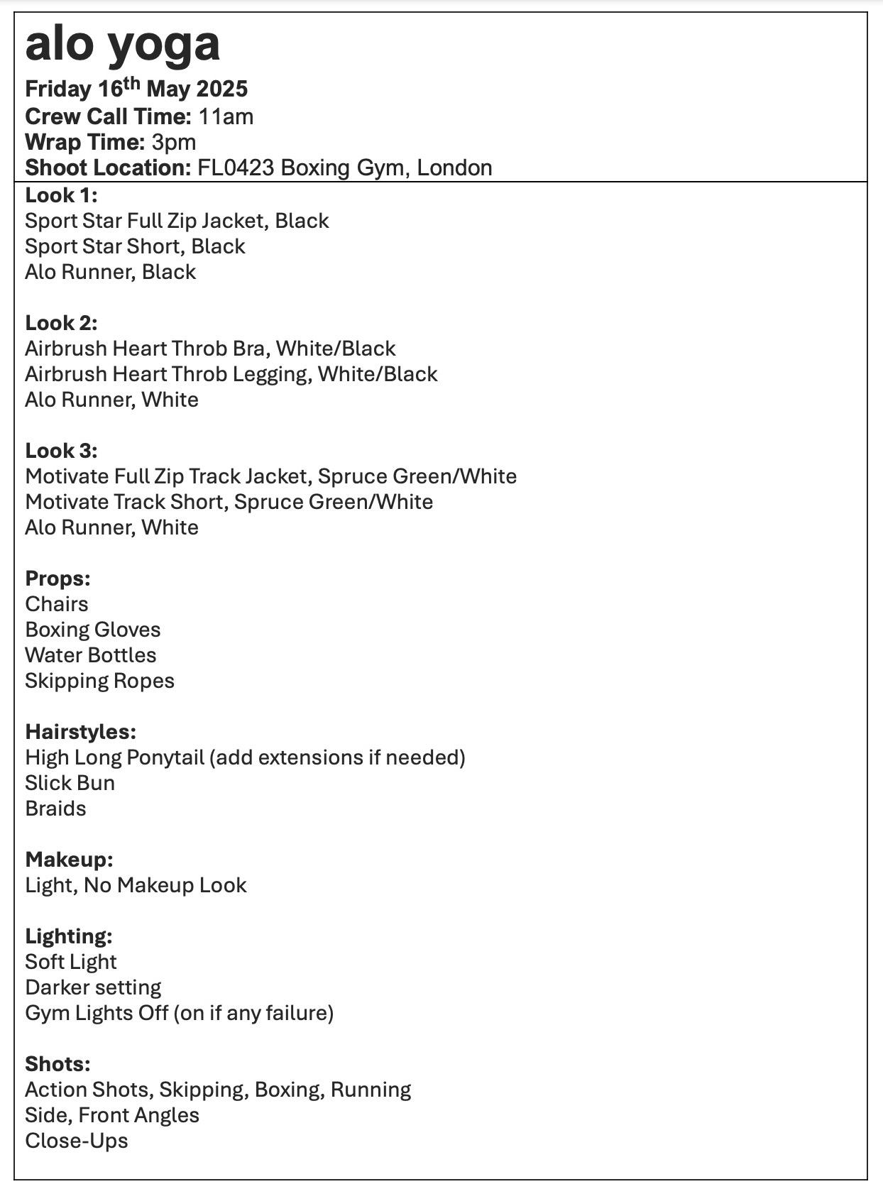 Following our session with Jenny, I created my own production plan for an Alo Yoga campaign.