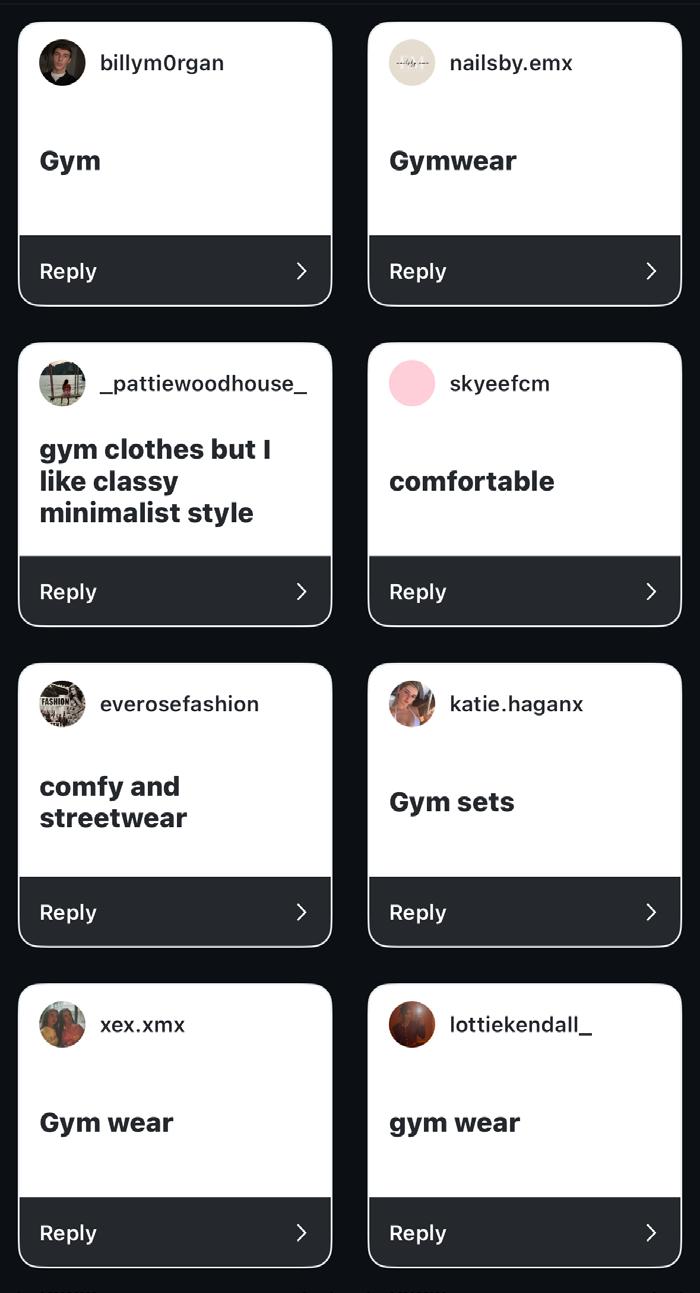 When researching into purchase patterns of Gen Alpha, and from my own interviews, lots of younger individuals are highly influenced by who they see on social media, or what their older sibling is wearing. They tend to copy those they look up to and admire and want to dress like them. For example, Lila’s style of comfort, wearing brands like Lululemon and Adanola, comes from what she sees her older sister Lottie and her friends wearing.