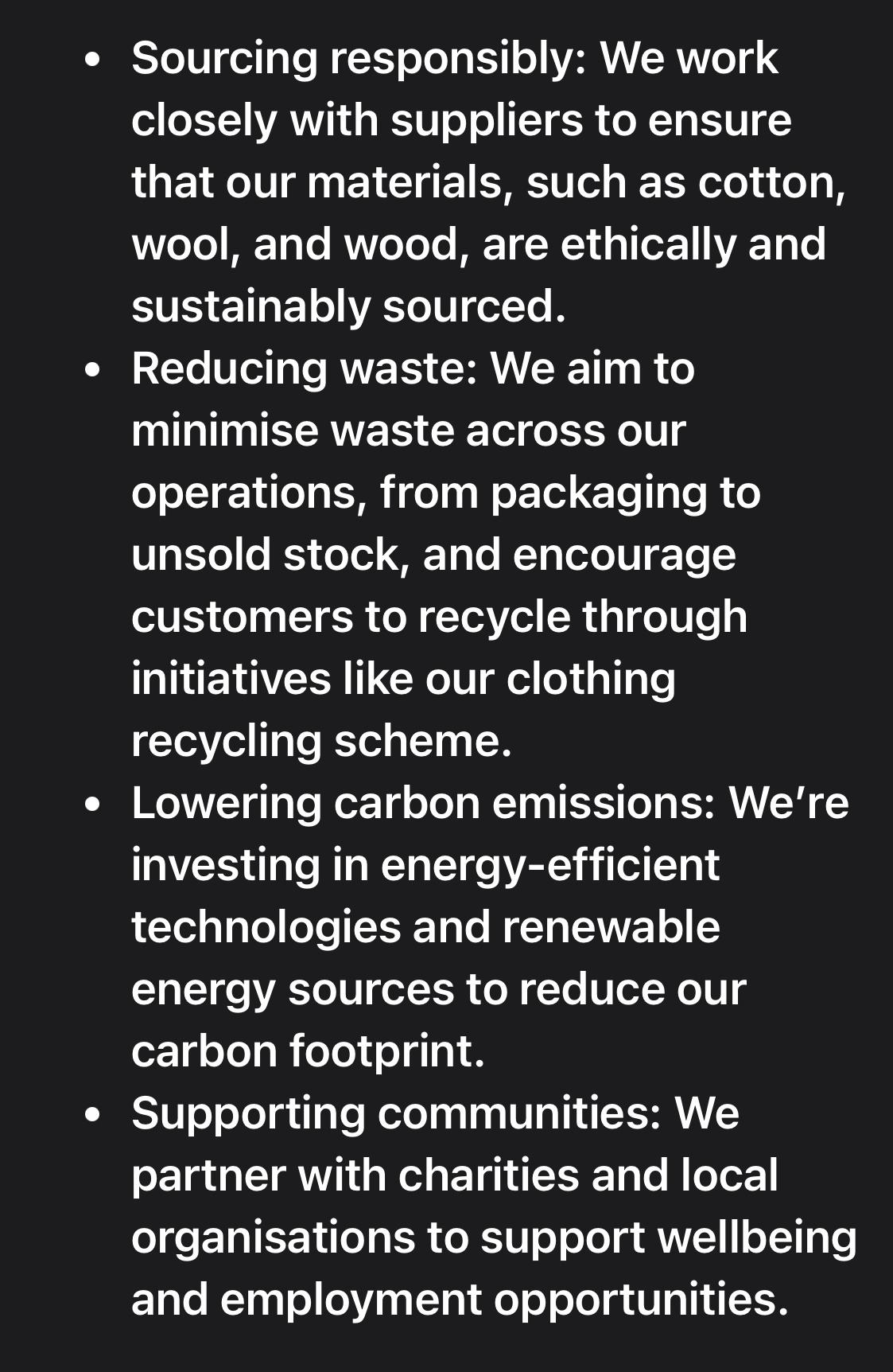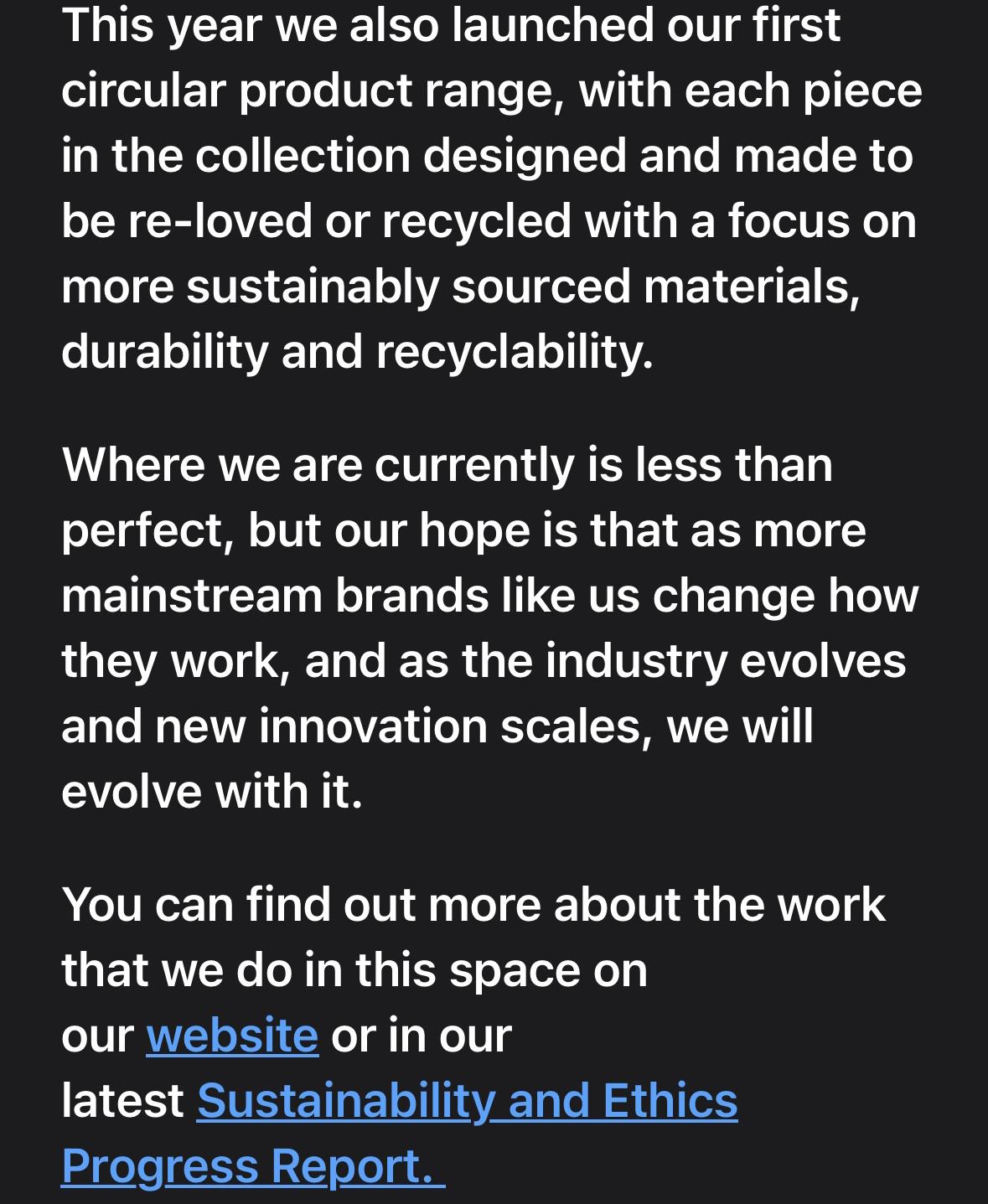 Lots of brands now are turning alot more sustainable online, in-store and overall. Brands such as Frugi and Pangaia use recycled materials and natural materials to create their clothes. Although some are not sustainable with the manufacturing process, brands such as Zara allow for you to bring in old delivery boxes to be recycled and reused for someone else’s order.