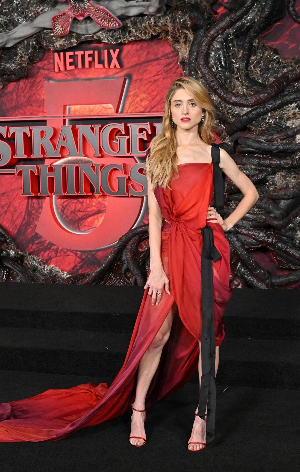 Natalia Dyer wears Andreas Kronthaler for Vivienne Westwood at the Stranger Things season 5 world premiere on November 06, 2025.