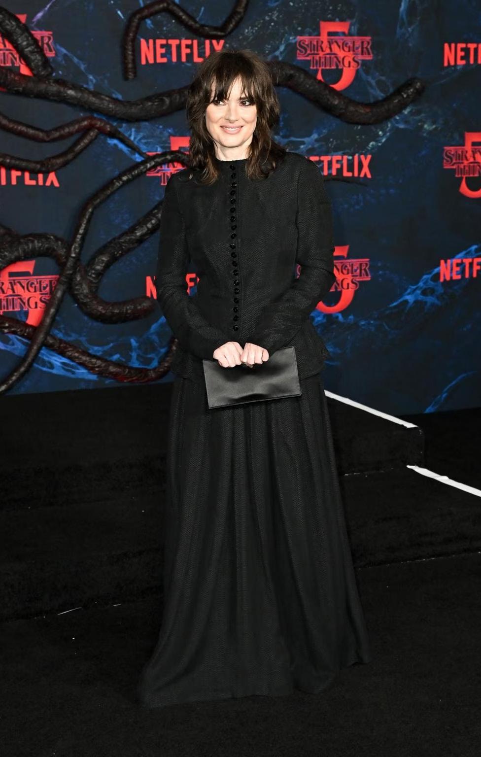 Winona Ryder wears vintage Yohji Yamamoto at the Stranger Things season 5 world premiere on November 06, 2025.