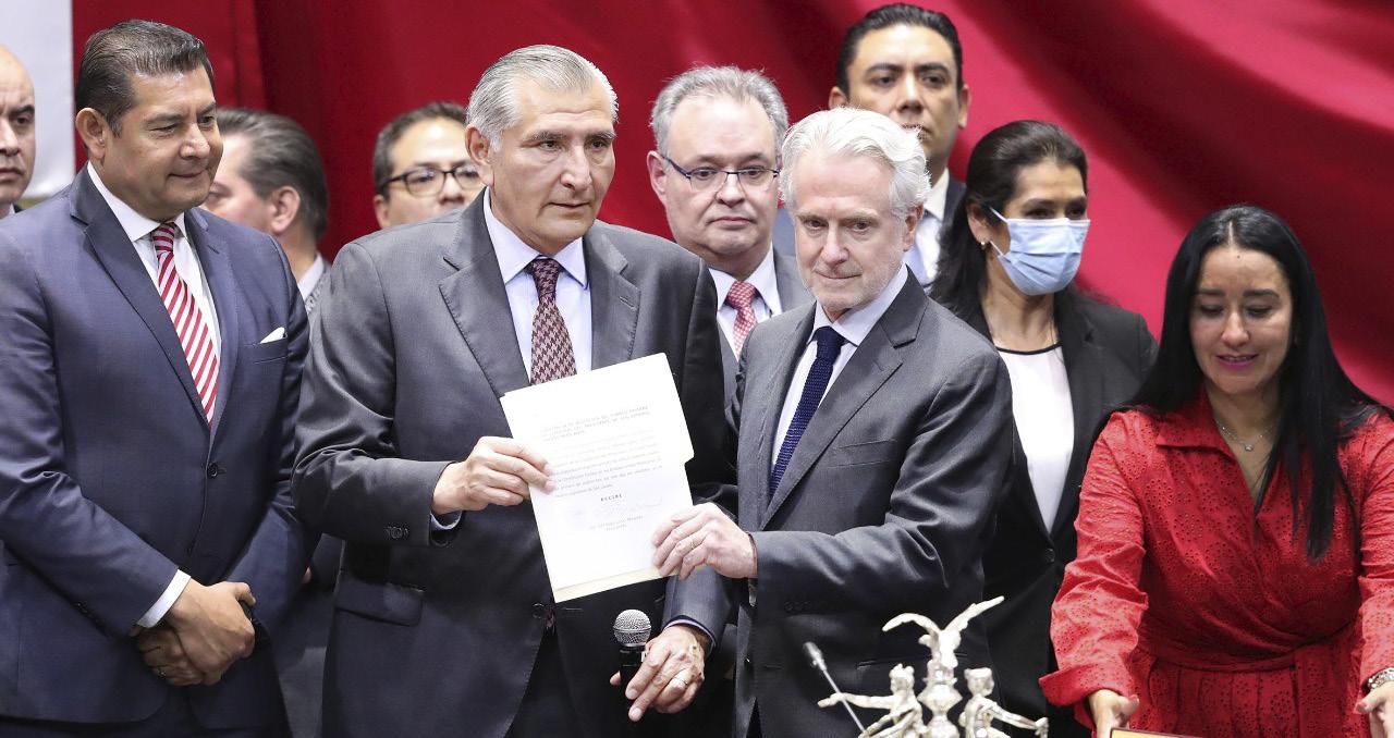 quién sonriente declaró a los medios de comunicación que siempre ha acom pañado al Presidente en sus informes y destacó que la educación es un reto para todos los mexicanos. Entre otros invitados, destacó el di putado Sergio Gutiérrez Luna y Raquel Buenrostro, jefa del SAT; el titular de la Marina, Rafael Ojeda. Además, llegaron las tres corcholatas de López Obrador: el secretario de Gobernación, Adán Au gusto Lópe; la jefa de Gobierno Claudia Sheinbaum, que tiene sus oficinas a unos metros de Palacio Nacional; y el canciller MarceloMientrasEbrard.lascamionetas Suburban, Tahoe y Acadia permanecían estaciona das cerca del recinto, un elemento de la Defensa paseaba a una unidad canina, quién olfateaba los vehículos buscando alguna anomalía en ellos. De pronto, mientras el informe trans curría, simpatizantes del Presidente, muy espontáneos, se manifestaron frente a Pa lacio Nacional destacando la “excelente labor que había hecho el Presidente”. Otra de las simpatizantes, la señora Patricia, gritaba porras frente a Palacio Nacional con otras personas. “Yo admiro todo lo que ha hecho por nosotros los mexicanos. Ha habido un gran cam bio, se ve. Y por eso estamos aquí, para apoyarlo y que sepa que el pueblo lo va a sacar a flote, así como cuando fue desa forado, aquí estamos para respaldarlo”, aseveró.Porotro lado, hubo quienes no les pa rece la forma de gobernar de López Obra dor. José Luis acudió con un cartel en el que reprochaba a AMLO la falta de clari dad con su gobierno, haciendo alusión a la famosa frase, “Yo tengo otros datos”. Al final del discurso, del evento y del ritual, los invitados VIP salieron a sus camionetas de lujo y los simpatizan tes del Presidente al metro de la ciu dad.... Ahora solo faltan dos informes más. / CIERRE. Aunque no impedíanlucíancallesZócalo,cerradocompletamenteestuvoelalgunasaledañasvallasqueelpaso.
