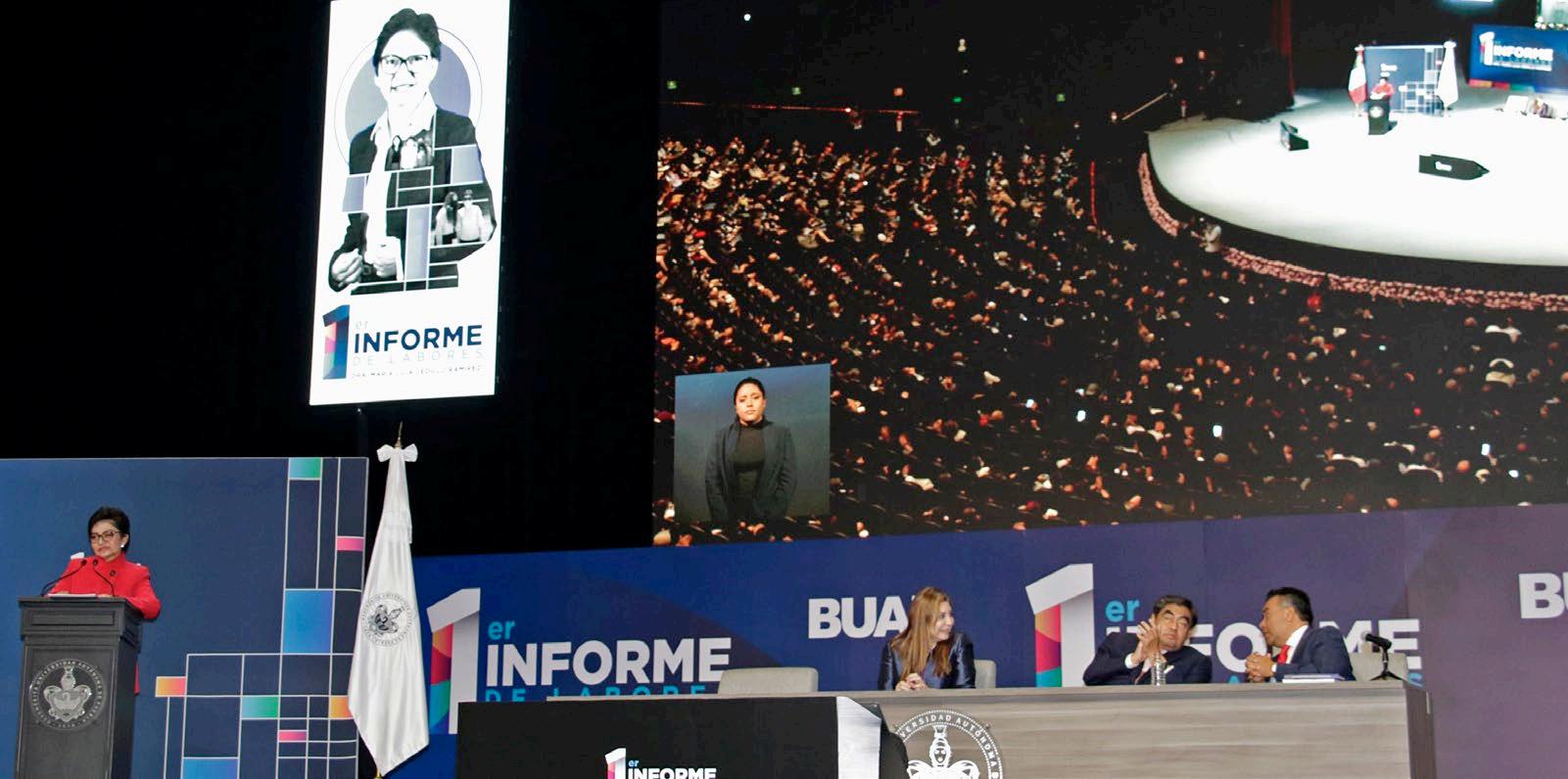 La rectora Lilia Cedillo lucía un vestido negro con un abrigo de color rojo, en un tono emotivo, fluido y con el acompañamiento de la comunidad universitaria destacó el traba jo intenso por la nueva cultura de la BUAP.