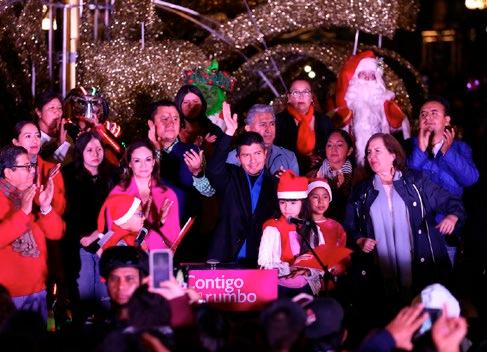 Eduardo Rivera Pérez, presidente muni cipal capitalino, y Liliana Ortiz Pérez, presi denta del Sistema Municipal DIF, presiona ron el botón que activó el Árbol de Navidad monumental del Zócalo.