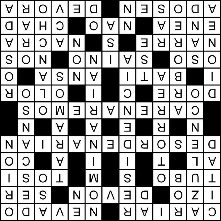 CRUCIGRAMA y de color pardusco. 40. Anea. 41. Nave. 43. República sin acceso al mar, en el norte de África central. 44. Arrimen de espaldas. 45. Traga con ansia y apresuradamente. Verticales 1. Emplazad a uno. 2. Azulado. 3. Arrope o zumo de una fruta mezclada con miel. 4. Nieto de Cam. 5. Lugar en que se reside. 6. Nombrarían. 7. Dentro de. 8. Cuezo a las brasas. 9. Reposo. 10. Célebre cazador griego, transformado por Diana en constelación. 15.