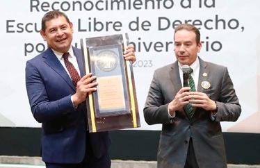 El presidente del Senado, Alejandro Armenta, entregó reconocimientos a directivos, maestros, consejeros y personal académico de la Escuela Libre de Derecho de Puebla, en el marco del 40 aniversario de dicha institución educativa.