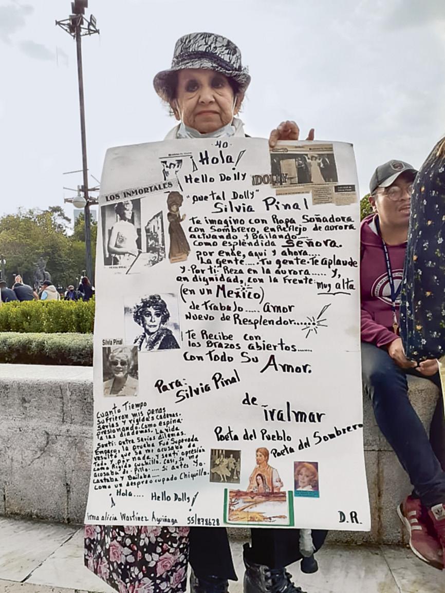 “En nombre de todas las mujeres que de cidimos dedicarnos al teatro musical, te doy las gracias por el ejemplo de disciplina y com pañerismo. Y, sobre todo, por la alegría que nos contagias y por tu inagotable vitalidad”, mencionó Bianca previo a interpretar Yo soy la juventud, de la obra Mame El nombre de Silvia Pinal es sinónimo de ta lento y disciplina, que fueron demostrados en cada momento que podían con porras y gritos. Diana Bracho recordó algunos momentos que ha vivido con la también productora y destacó que ella siempre ha sido una persona que ha amado su trabajo en la industria del entretenimiento.Enlapartefinal del evento, Silvia Pinal recibió un reconocimiento por parte de la Secretaría de Cultura donde destacaron su amplia trayectoria. Ante esto, la actriz agra deció“Mesorprendida.sientotanemocionada en este mo mento, me siento llena de cosas con la gente que me quiere y el teatro que tanto amo…”, mencionó brevemente la primera actriz. Por su parte, Alejandra Guzmán en repre sentación de la familia agradeció todo lo que les ha “Quierodado.agradecerte madre, todas las co sas que nos has demostrado que cualquier mujer puede hacer. Has hecho más que esto, has logrado un sueño y has logrado más que cualquier mujer como artista, como madre, como lo que te conozco. Gracias por darnos la vida y una familia bella y llena de disciplina y ejemplo”.Previoaque iniciara el homenaje Erik del Castillo, Arcelia Ramírez, Luz María Aguilar e Isaura Espinoza aplaudieron el que Bellas Artes haya sido el espacio para darle un ho menaje en vida a la primera actriz. Al finalizar el evento personas seguían fue ra del recinto esperando ver a celebridades que se dieron cita. Algunas de ellas fueron Susana Zabaleta, Leticia Calderón y Erendira Ibarra, entre muchas más.