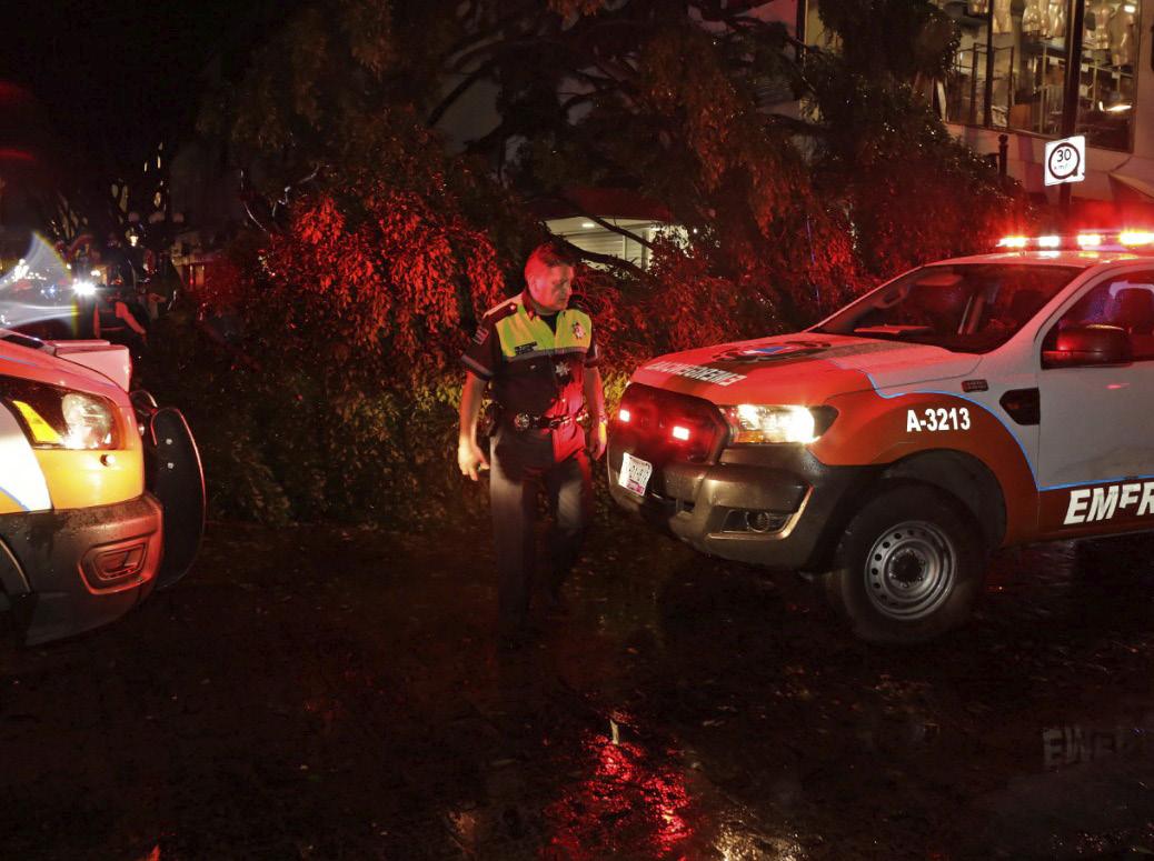 Una fuerte lluvia azotó el Centro His tórico de Puebla y colapsó dos árboles, uno de estos cayó sobre un quiosco de venta de periódicos, sitio en el que murió un Brigadasadolescente.deProtección Civil Mu nicipal y Estatal, emergencias y pri meros auxilios, laboraron en el lugar para seccionar un enorme espécimen que aplastó la estructura ubicada en la calle 5 de Mayo y 2 Poniente – Oriente, donde una familia se resguardaba. Un adolescente sin vida, dos adul tos y un bebé lesionados fue el saldo del colapso del enorme árbol que aplastó la caseta de periódicos. Otro árbol se cayó en la 5 de Mayo y causó afectaciones materiales en una tienda. Otros puntos que re portan árboles derribados por las ráfagas de viento, lluvia y granizo son en la zona de la secundaria en el Centro Escolar Niños Héroes de Chapultepec (CENHCH), la colo nia Bella Vista, uno más en avenida Independencia y 15 de Mayo, y otro sobre la calle 7 Norte y 22 Poniente. Otro árbol colapsado se registró calle 20 Norte y la avenida Juan de Palafox, además en la esquina de 31 Oriente y 24 Sur. Dos árboles tirados sobre el carril del Ruta en la Diagonal Defensores frente al paradero de la 18 Poniente también fueron reportados. Las ráfagas de viento destrozaron los cristales del Museo del Automóvil, en calle 3 Sur y 15 Poniente. Había vidrios colgando. / JOSÉL MOCTEZUMA