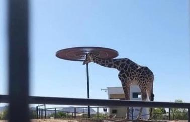 Benito es una jirafa de tres años que fue llevada a un zoológico en Ciudad Juárez, el calor alcanza los 33°C y esa la única forma de cubrirse del sol
