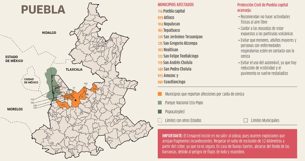 El secretario de Gobernación, Javier Aquino, informó que las partículas cayeron en Puebla, Nopalucan, Tepatlaxco, San Jerónimo Tecuanipan, San Gregorio Atzompa, Nealtican, San Felipe Teotlalcingo, San Andrés y San Pedro Cholula, Amozoc y Cuautlancingo. Ayer se registraron 28 exhalaciones y mil 332 minutos de tremor y un sismo volcanotectónico en el coloso. El Semáforo de Alerta sigue en Amarillo Fase 2 LOCAL P. 7