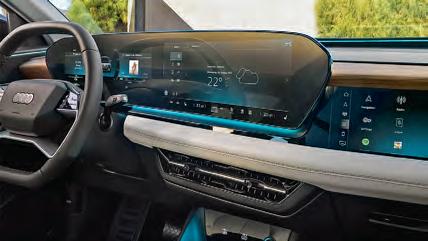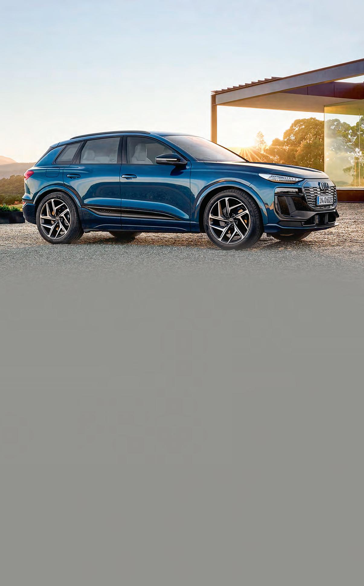 que permite un amplio espacio para las piernas, especialmente en la segunda fila de asientos. En la parte frontal destacan unos faros divididos. Por un lado, están las luces diurnas, las cuales ahora ofrecen hasta ocho animaciones luminosas, provenientes de 70 LEDs individuales, las cuales se pueden configurar a través del sistema de infoentretenimiento, o por medio de la aplicación my Audi. Este Q6 e-tron destaca