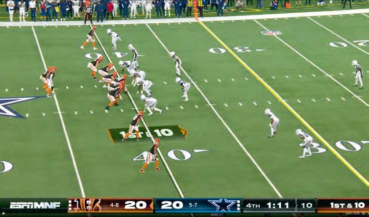 Empatado el partido a 20 puntos con menos de dos minutos en el último cuarto, un error de Dallas en una patada de despeje de sus rivales, le dio una última oportunidad a Burrow para liderar a su equipo rumbo a su quinta victoria de la temporada, que concretó el mariscal con Ja’Marr Chase para la anotación final.