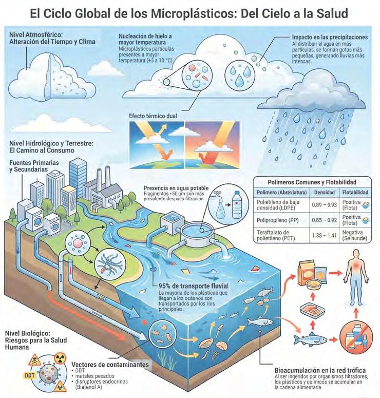 El biólogo Salvador Castell González, fundador de la organización Va por la Tierra, explicó que, la atmósfera se ha saturado de microplásticos —partículas menores a 5 mm— que viajan miles de kilómetros, afectando desde las ciudades más densas hasta la cima del Monte Everest y los glaciares más remotos.