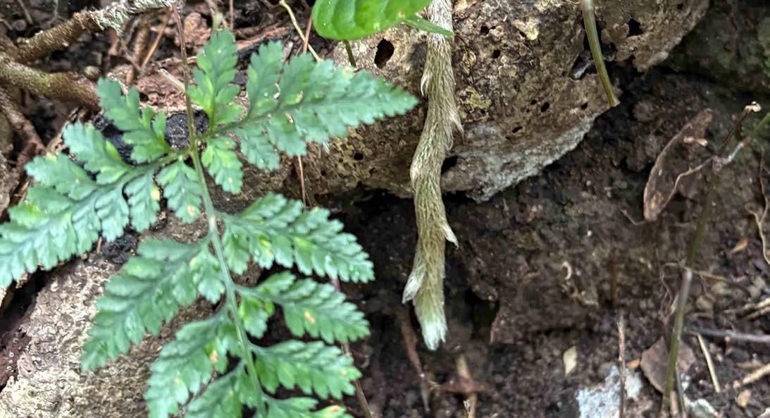 “The fronds of Hare’s Foot Fern, showing the mix of darker and paler colours on the rhizomes. While the newer shoots are pale, the more established part of the rhizome is covered in dark hair-like scales.” – photos by Conrad Denyer and Emma Rooksby.