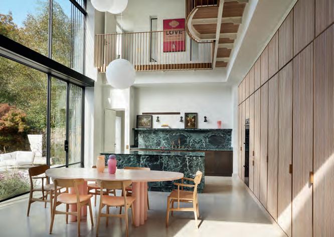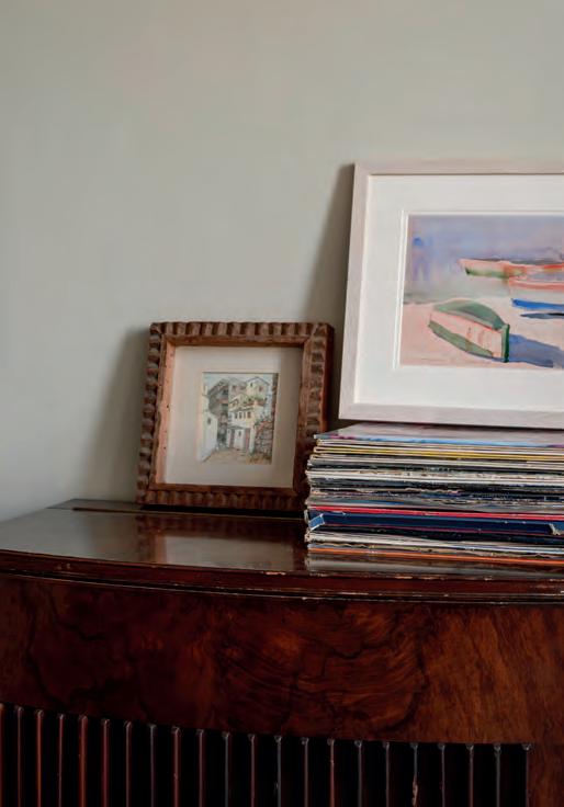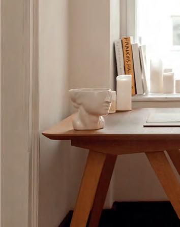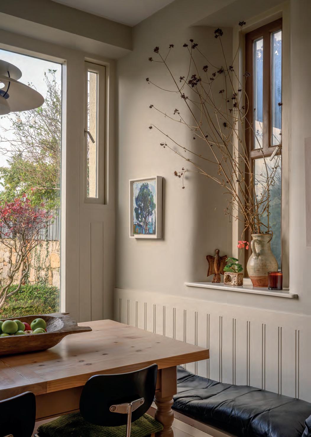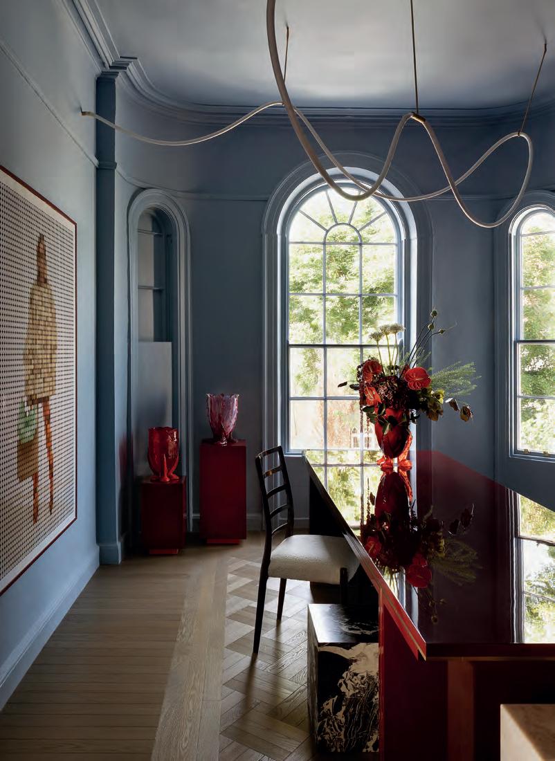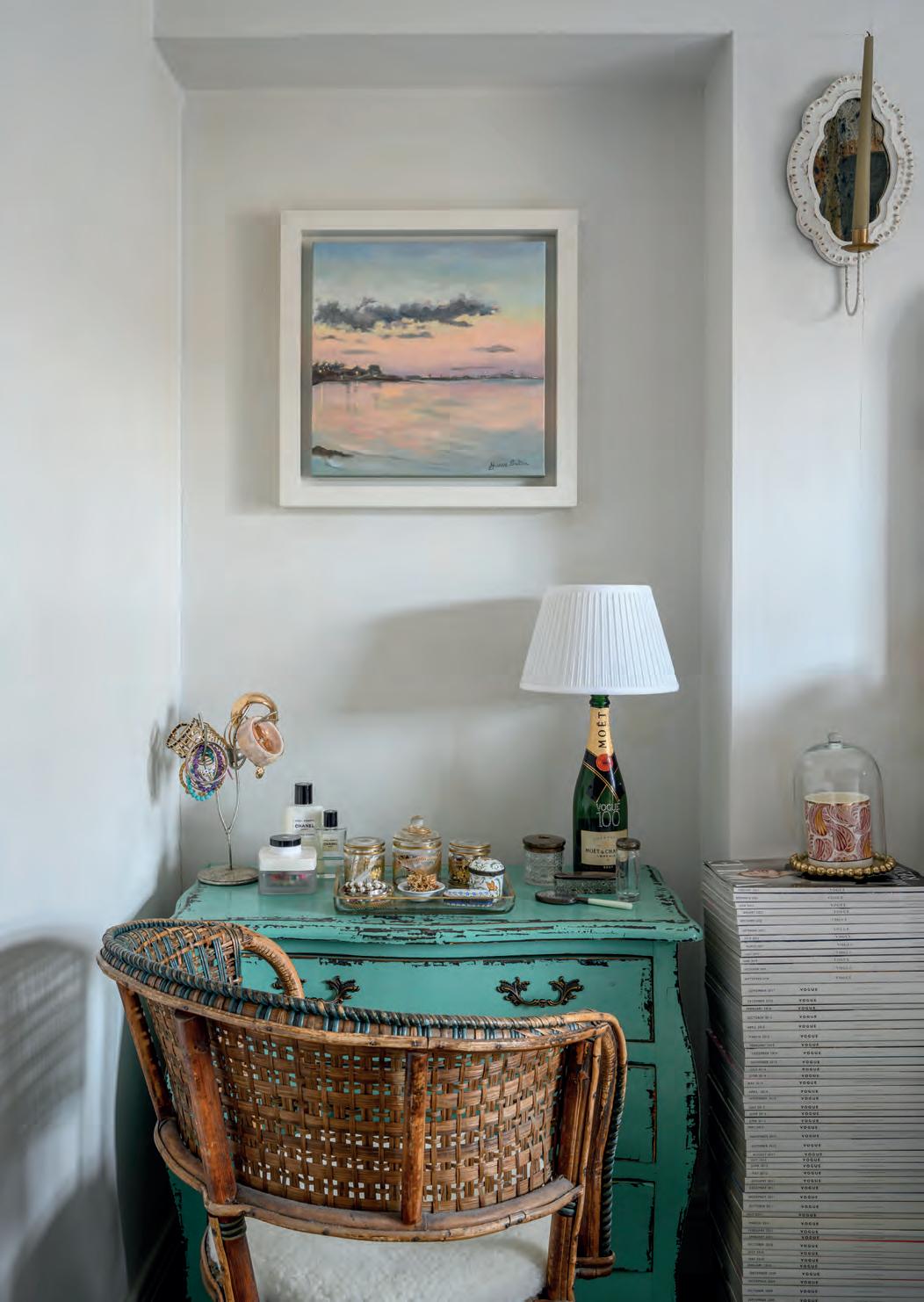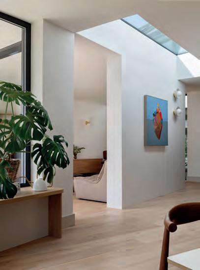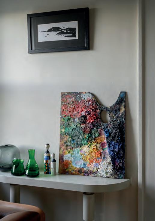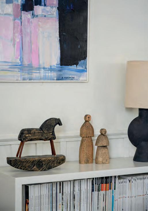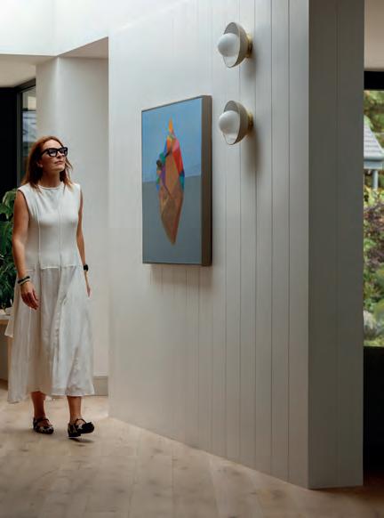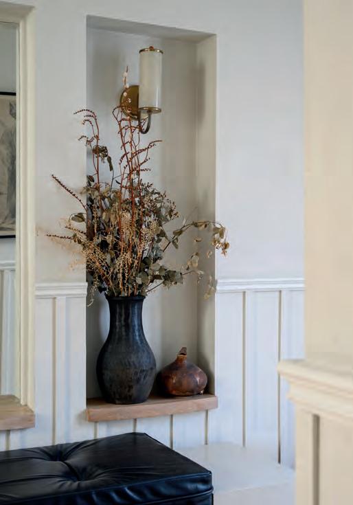 paints. I avoided stark white paint, using instead soft pigments from French brand Argile, whose nature-inspired tones set the palette. Lighting is key. Every piece of art is intentionally lit - if you love something enough to display it, you should see it properly. A home should be social. Eight can gather at our dining table, eight can relax in the living room, and there’s room for everyone to gather around the kitchen island with wine. Hosting brings me joy, so the layout supports that.