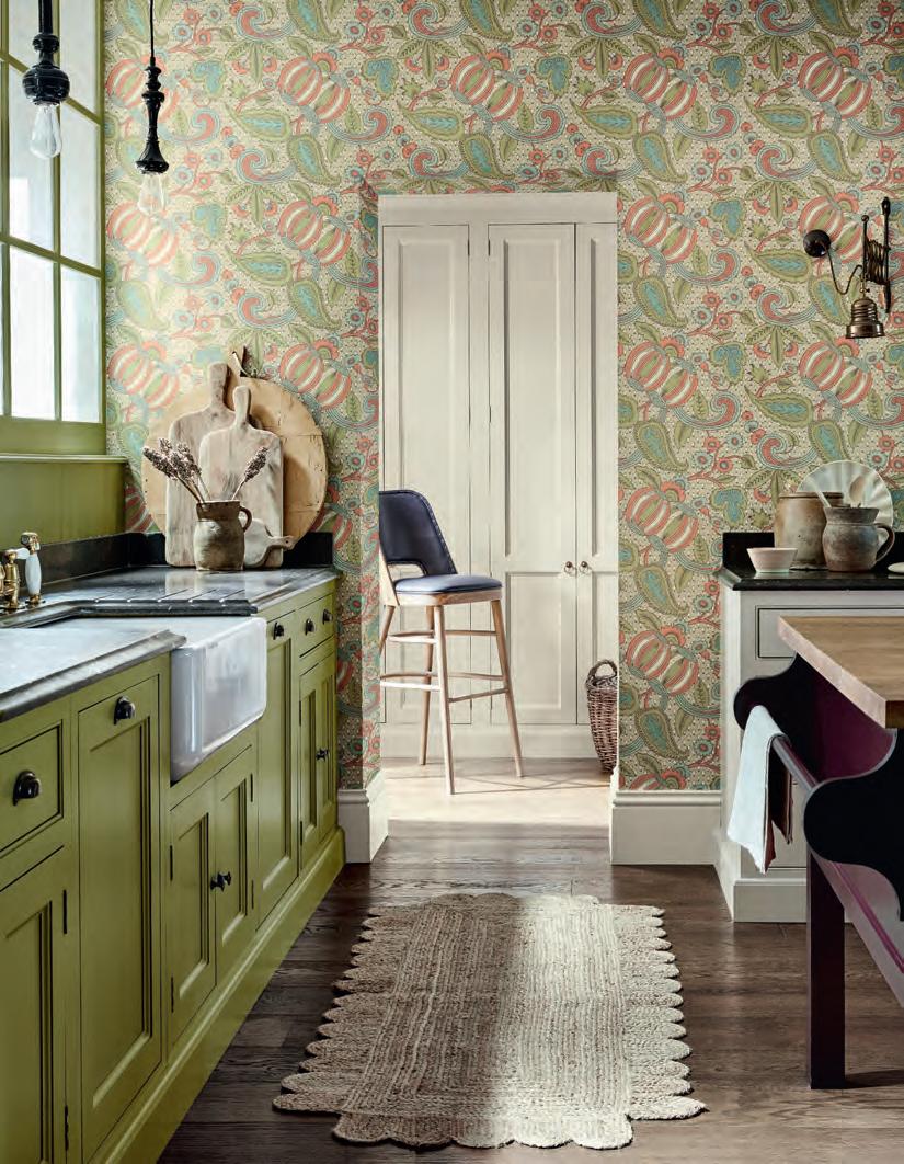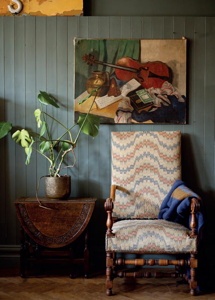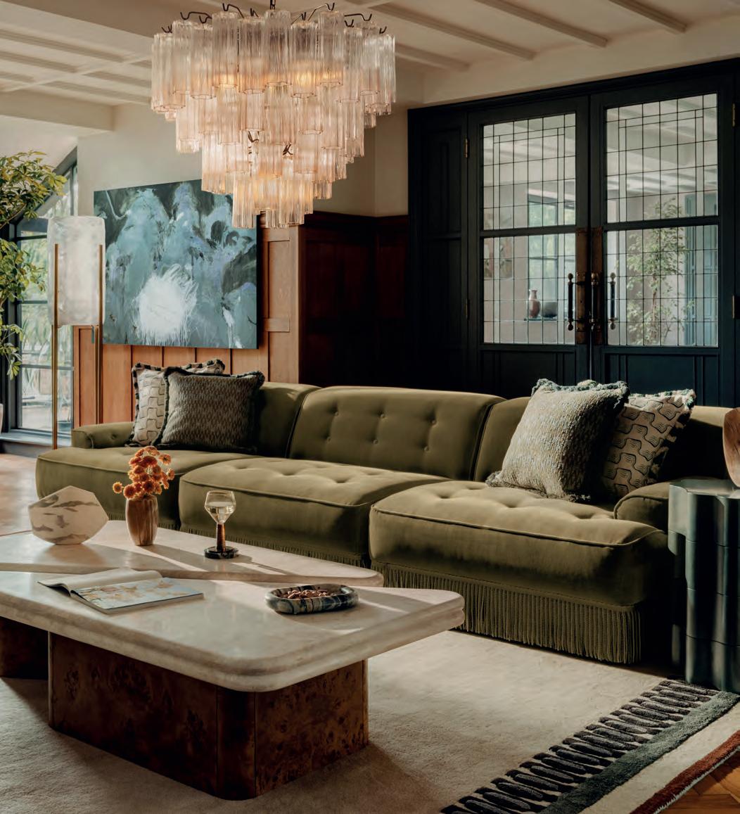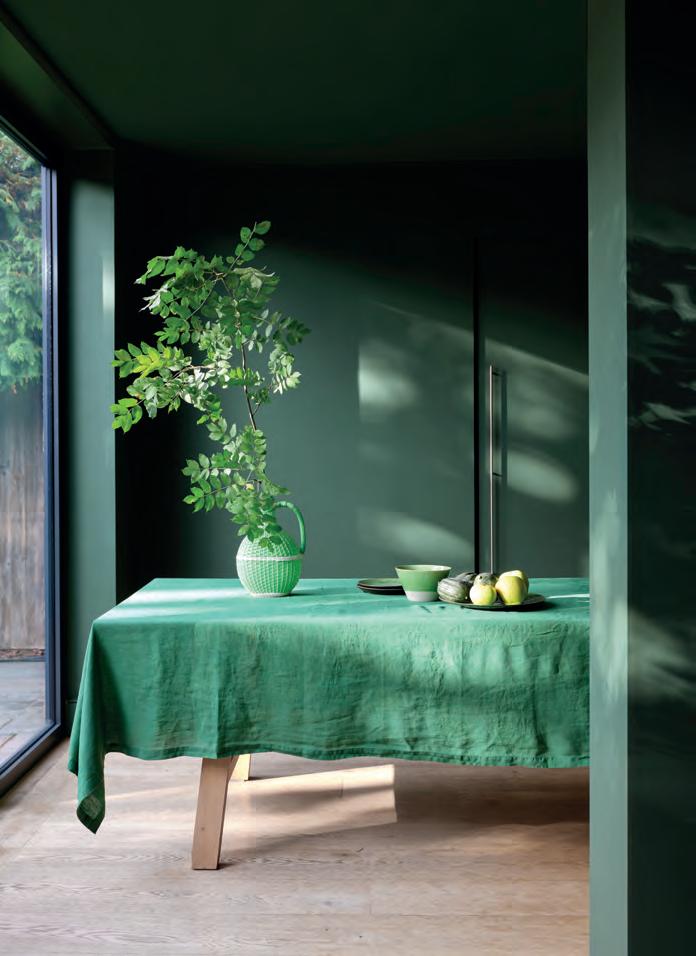 MOODY GREEN MAGIC The signature palette of deep greens, moss, and smoky neutrals creates an instant sense of calm.