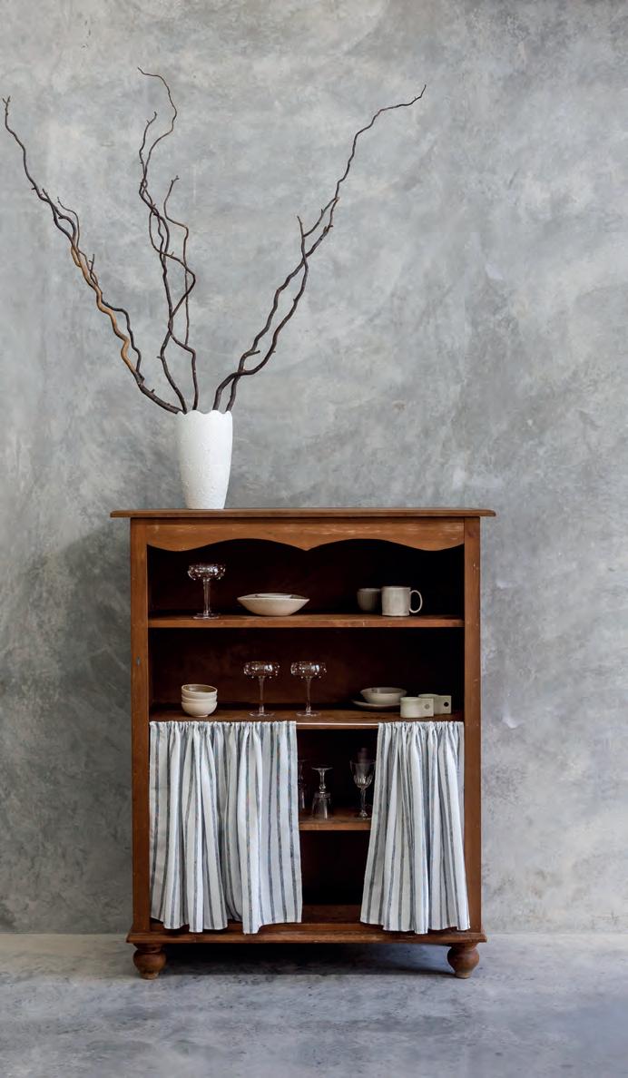 LEFT Joharn shows a guide to upcycling a simple kitchen cupboard by adding a cafe curtain. In the book there’s a step-by-step plan for achieving this in an hour