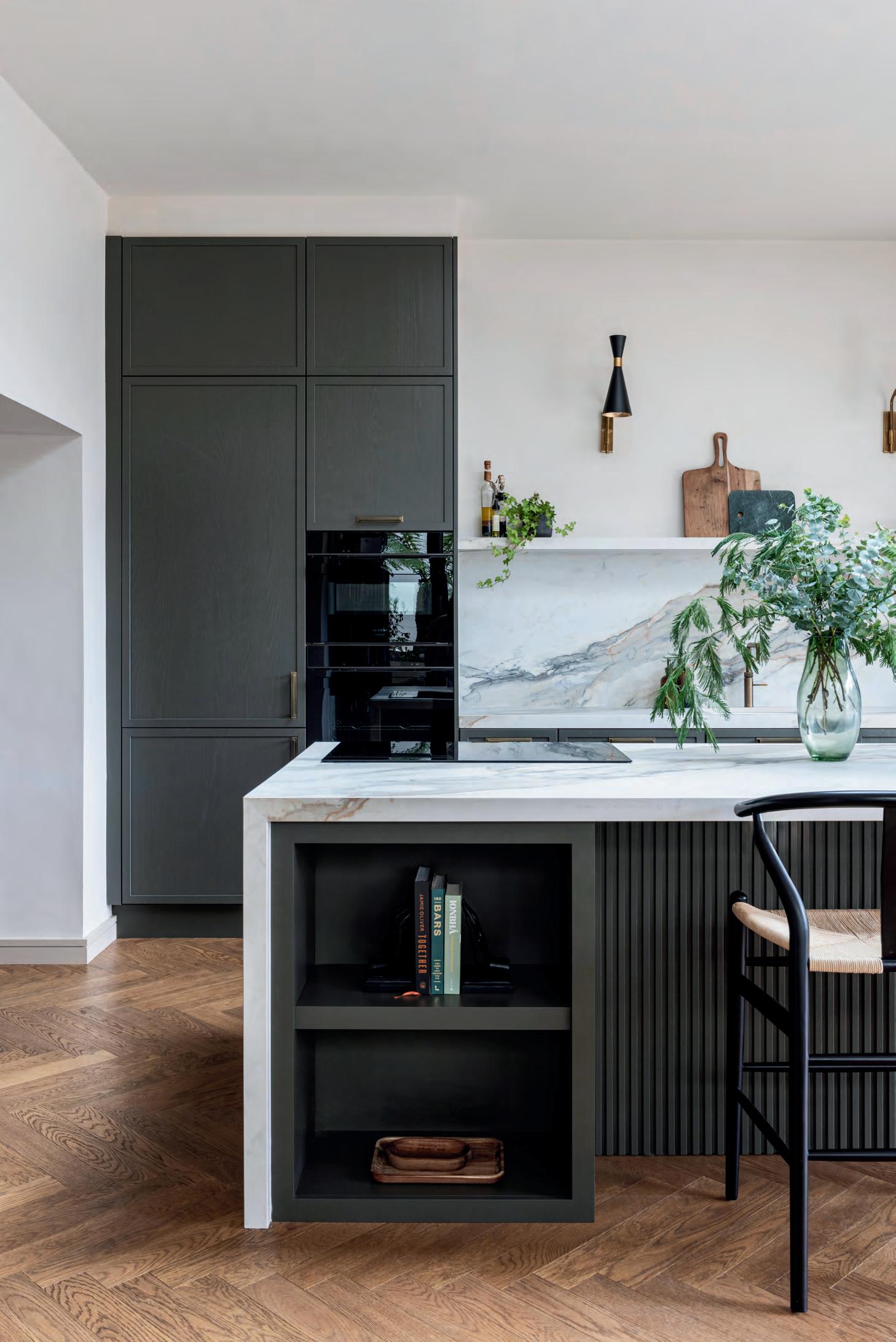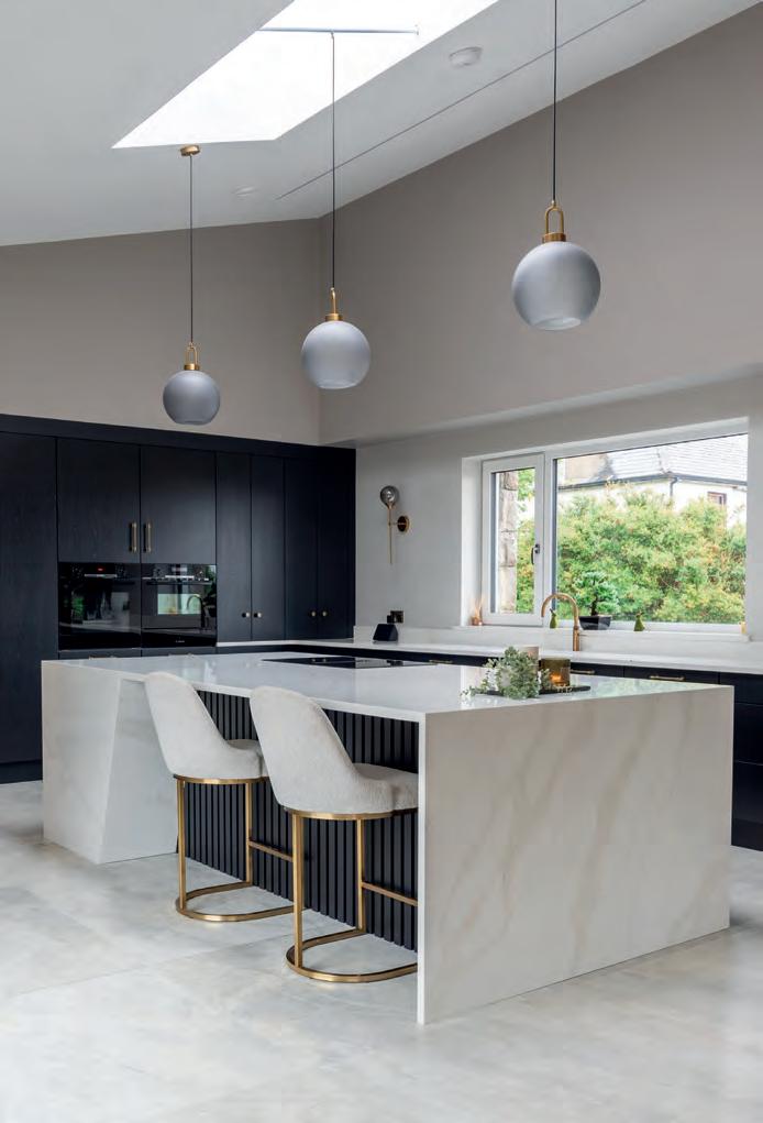 The Kube kitchen features black oak cabinetry with discreet top-mounted handles and luxe Silestone Calacatta gold worktops. The fluted glass pendants above the island and brass-armed wall lamps, are from Lightplan; tan leather and metal bar stools are from Enhance Interior Design