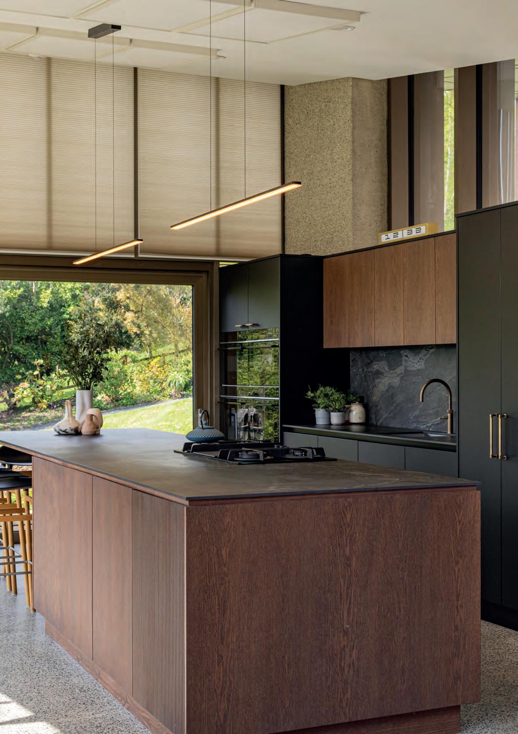 Kitchen cabinetry in Casa Noir with oversized waterfall island in 30mm Mont quartz; Quooker Fusion brass tap; Create Collection pendants from Hestiaco; Callie bar stools from BuyitDirect; Neff induction hob with downdraft extraction
