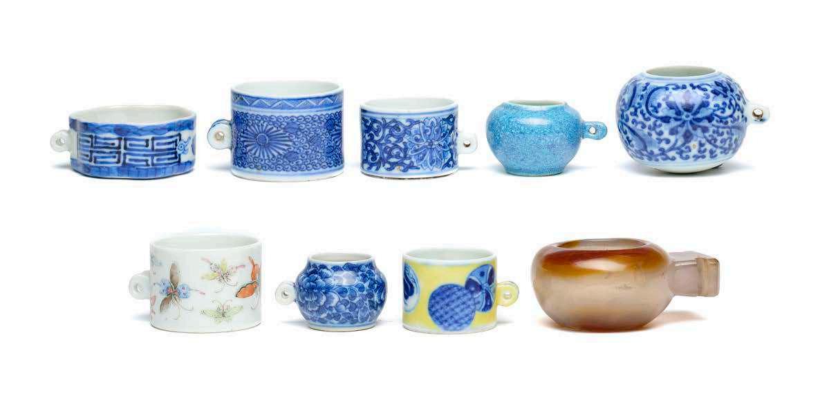 the standing mythical beast with long horns and scaly body has an oblong ‘ear’ cup projecting below a small hole in its mouth, the haunches are decorated with scrolls and a cylindrical water dropper fits into an opening in the back of the hollow body, 16.5cm long