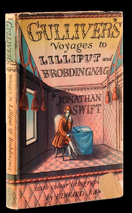 JONATHAN SWIFT, GULLIVER’S VOYAGES TO LILLIPUT AND BROBDINGNAG, published by The Folio Society, First Edition, 1943, Hardcover, with full-page colour lithographs by Edward Bawden, with burgundy cloth spine with marbled boards and a gilt-lettered black title label, in original, unclipped dustjacket designed by Bawden, 152pp.